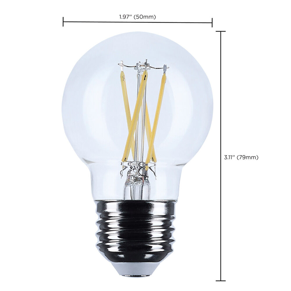 This LED bulb from Satco features a G16.5 globe shape in clear glass with a neutral-white 3500K color temperature. The E26 medium base makes it compatible with most standard fixtures - ceiling fans, pendant lights, exposed sockets, or decorative globes - where you want both visibility of the bulb and quality light. The clear finish allows the internal lighting to shine through cleanly, adding sparkle rather than diffusing it heavily.