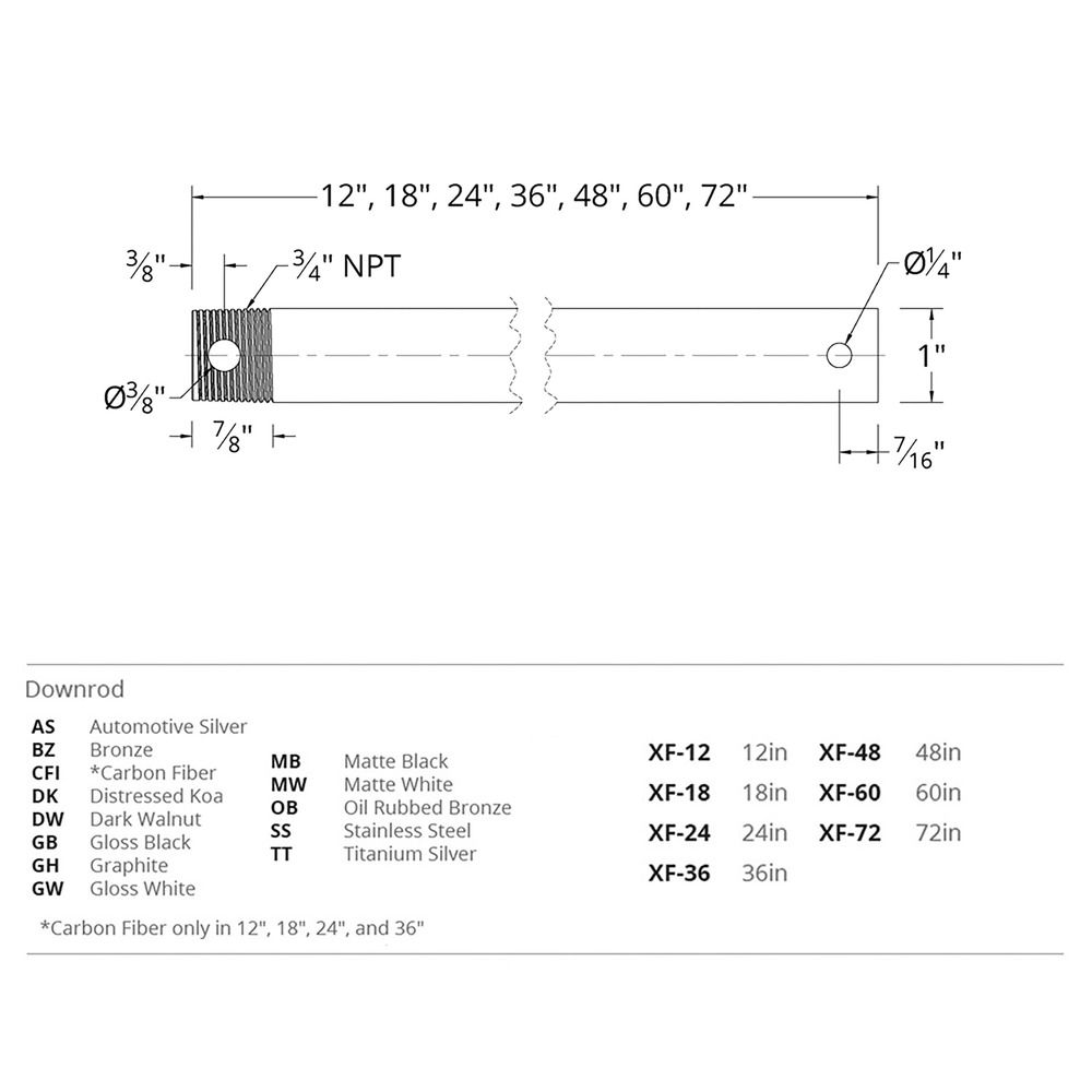 Fan downrods can be used to extend downrod ceiling fan height. Downrods are available in 12, 18, 24, 36, 48, 60, and 72 inch sizes along with a variety of finish options to match your fan finish. Downrods can be joined together using a downrod coupler (XF-I) to make lengths greater than 72in and may also be shortened in the field.