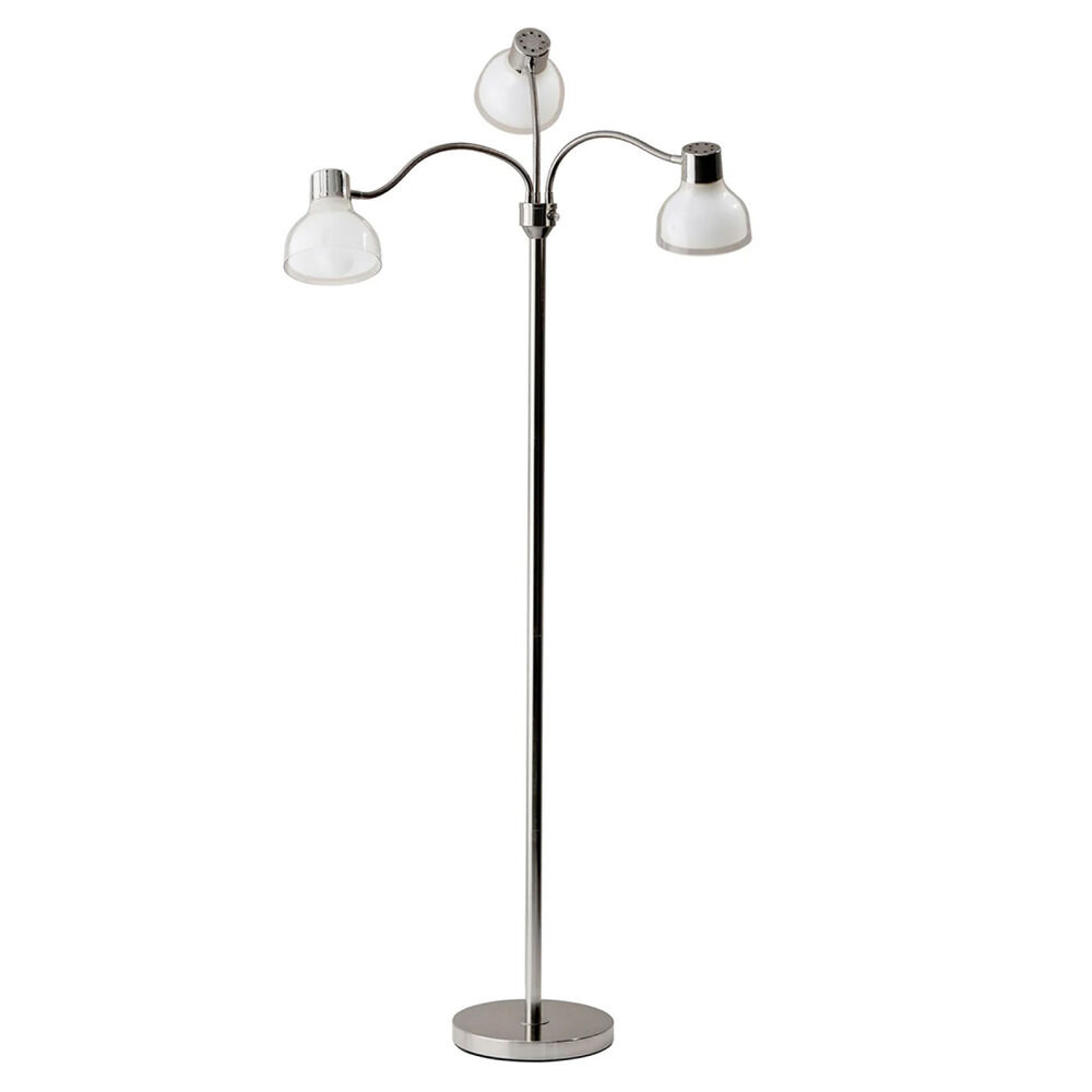 Enhance your bedroom or living room with the Presley 3-Arm Floor Lamp. A simple, yet functional style updated with a polished nickel finish and a unique shade construction. A clear plastic outer shade covers a frosted inner shade creating a beautiful glow when lit. Three adjustable gooseneck arms conveniently bring the light to wherever it is needed. This floor lamp can function as both an ambient light source for a large living space or directive task lighting for a workspace. A rotary switch on the pole adjusts the light to 3 different settings: 1 light on, 2 lights on, all lights on, and off. This lamp is smart outlet compatible and has a clear cord. Bulbs are not included.