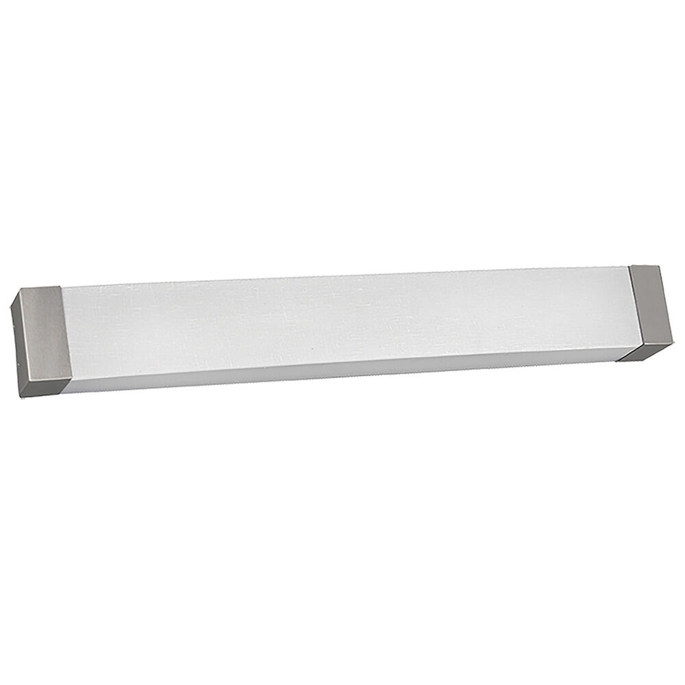 Simplistic curved design LED vanity features angled metal trim ends. Available in two finish and three lengths. Linen acrylic front diffuser.