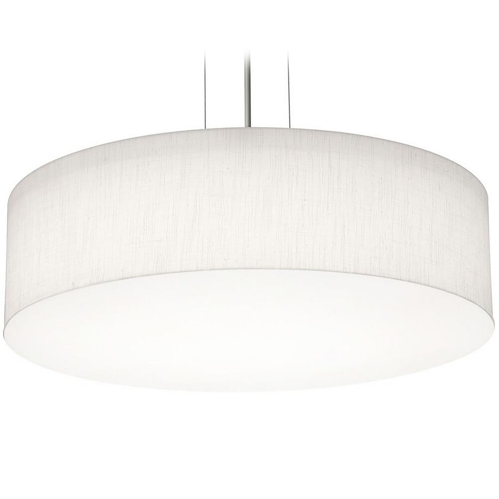 Modern single drum pendant fixture features LumaFuse laminated fabric/acrylic shade that is durable and easy to clean. White bottom acrylic diffuser disperses the light evenly. Available in five sizes, two canopy finishes and two shade finishes. Medium base lamping.