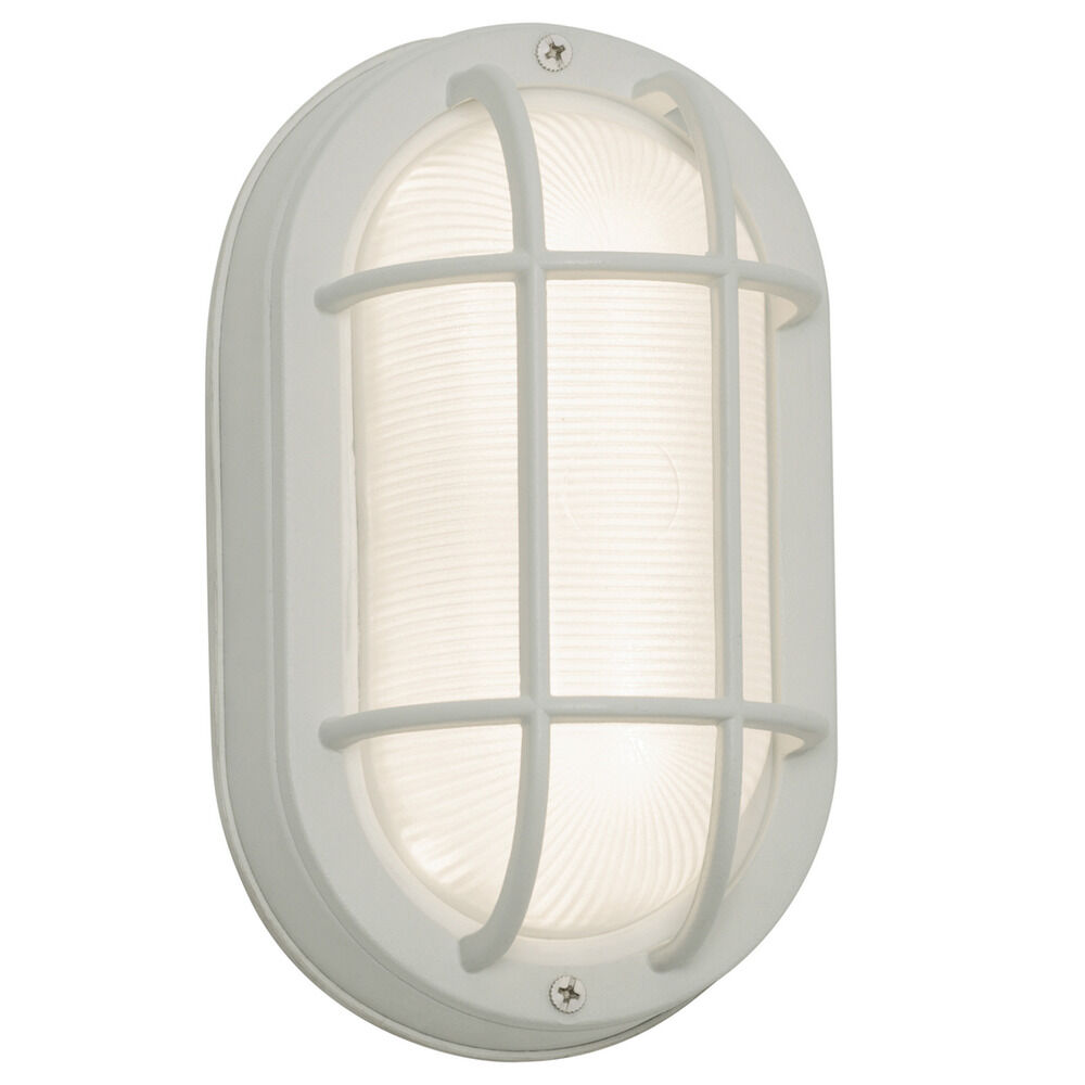 Nautical outdoor LED sconce with die-cast aluminum housing and protective guard. Frosted ribbed glass diffuser. Durable powder coat finish. Available in two colors.