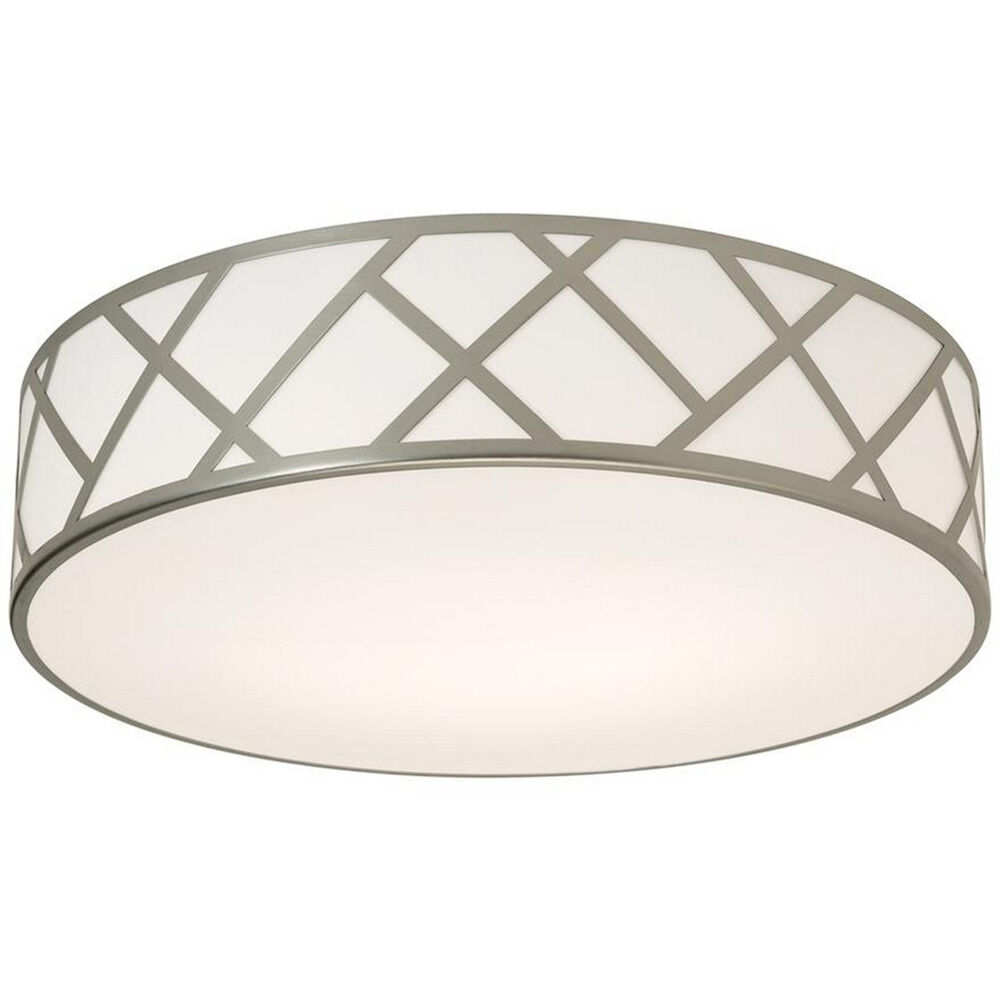 Stylish contemporary flush mount with a metal geometric pattern accent. Full white acrylic diffuser on side and bottom. Available in two finishes and three sizes. Uses medium based lamps.