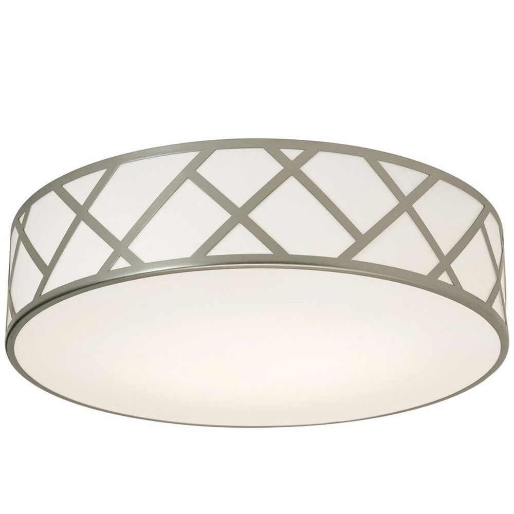 Stylish contemporary flush mount with a metal geometric pattern accent. Full white acrylic diffuser on side and bottom. Available in two finishes and three sizes. Uses medium based lamps.