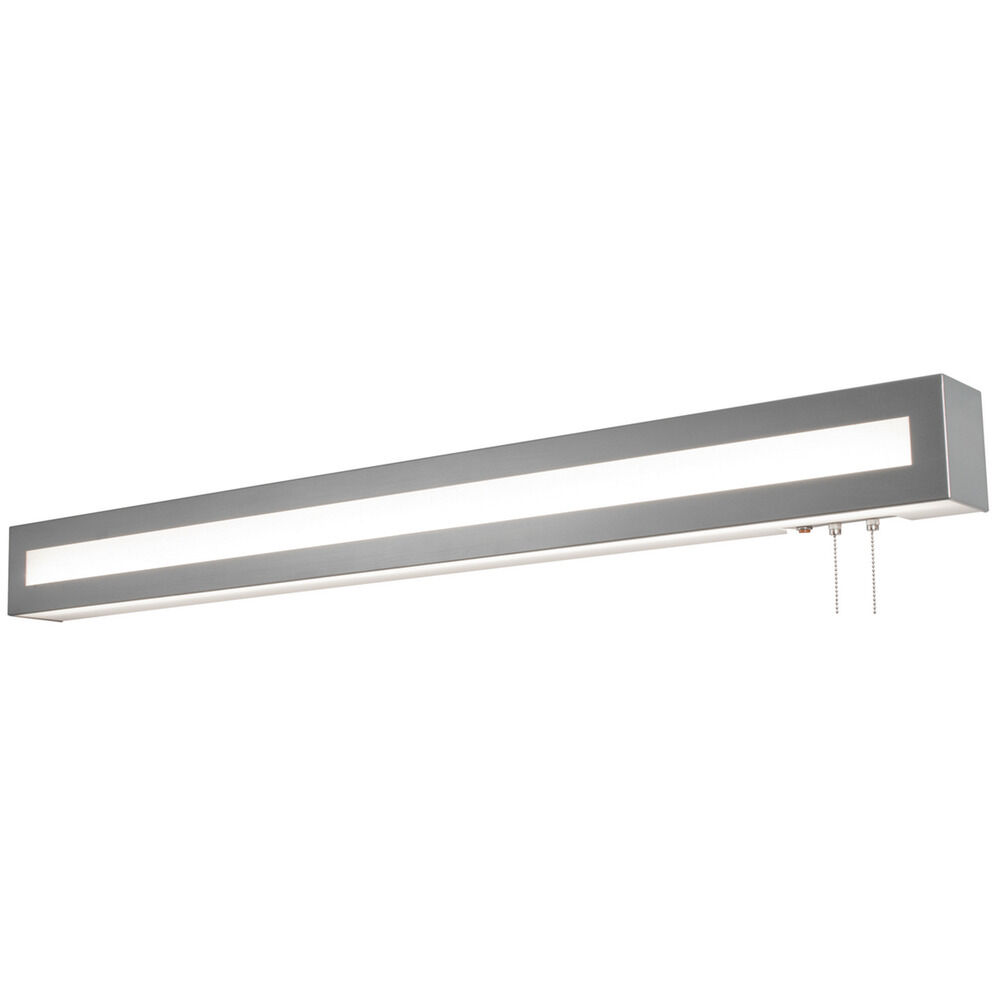Modern metal wrap LED overbed with 4-way pull switch. Features a linen front diffuser and white acrylic top and bottom diffusers. Available in two finishes and two lengths.