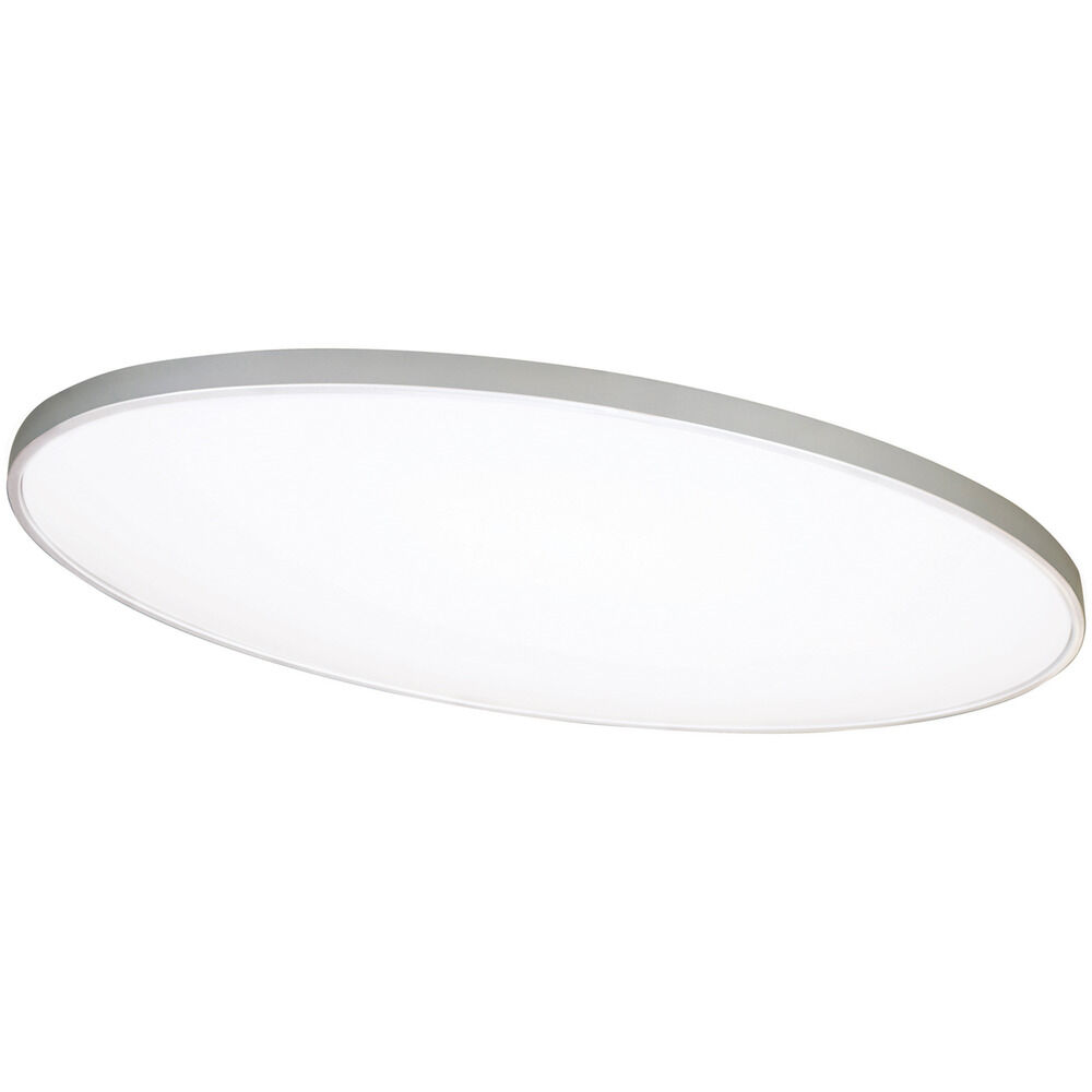 Modern LED oval flush mount with metal trim band. White acrylic diffuser offers an even, wide distribution of light.