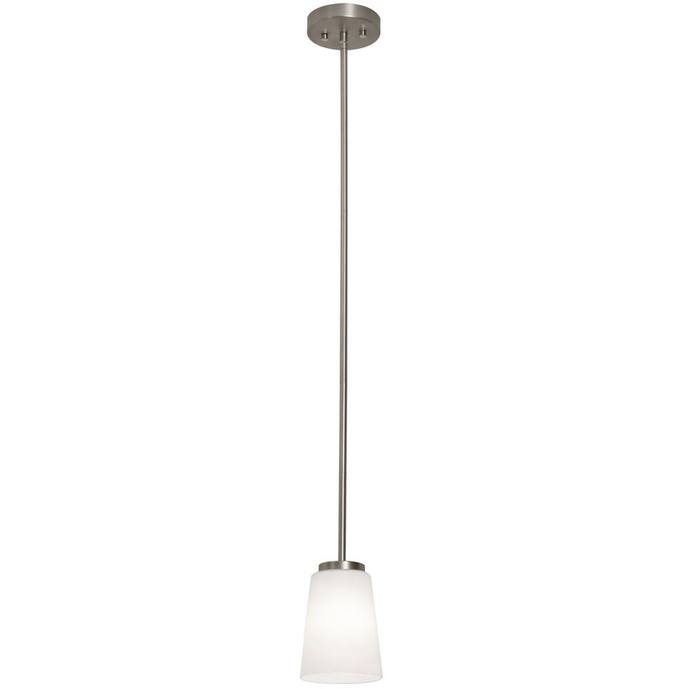 Contemporary single light mini pendant with 5 ft. adjustable stem. Clear glass diffuser with black finish or white glass diffuser with satin nickel finish. Medium base sockets with 60W Max lamps (not included)