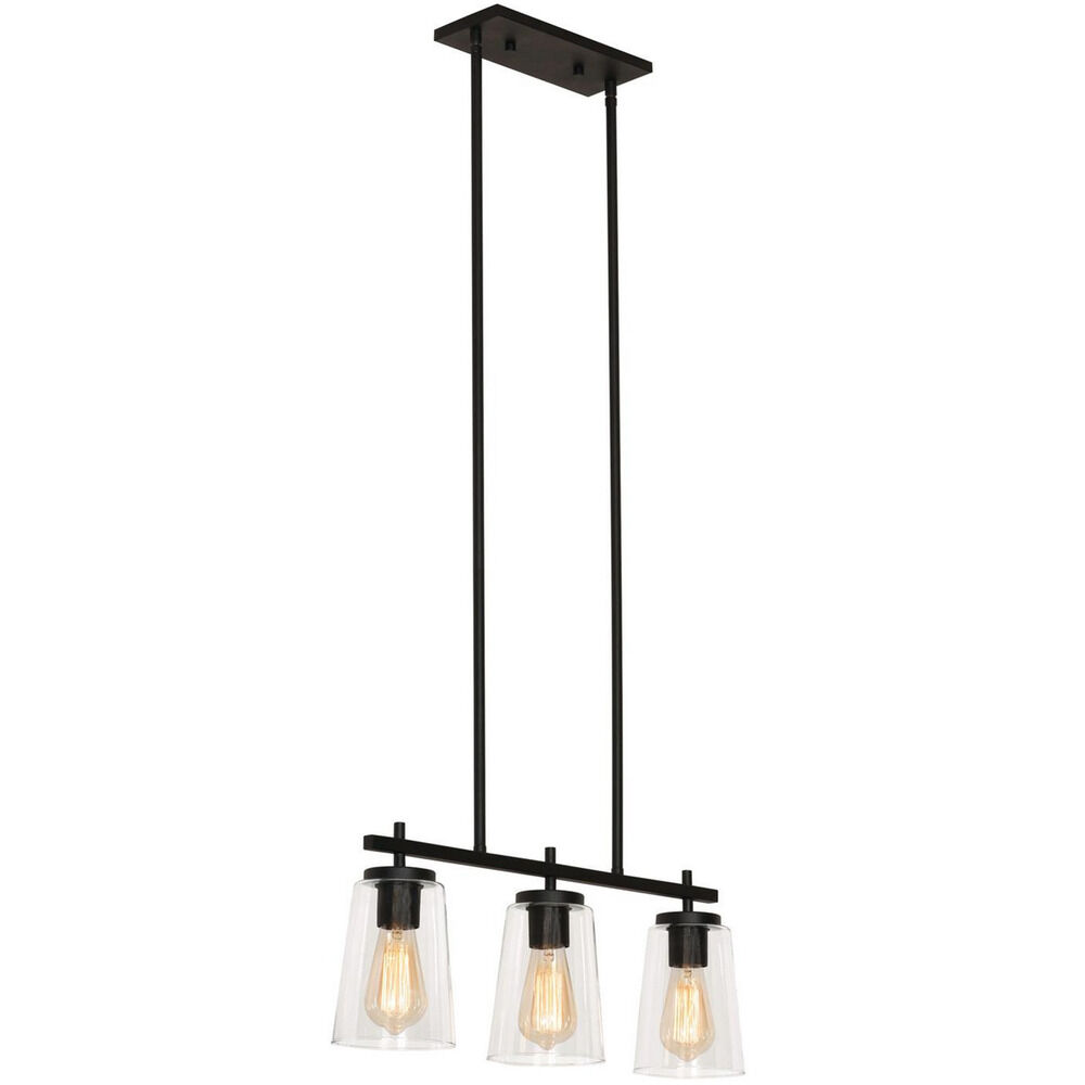 Contemporary three light pendant with 5 ft. adjustable stem. Clear glass diffuser with black finish or white glass diffuser with satin nickel finish. Medium base sockets with 60W Max lamps (not included)