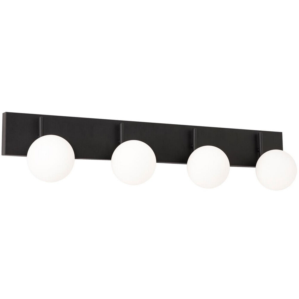 Modern appeal, LED vanity with white glass globe diffusers. Metal construction. Available in three finishes.