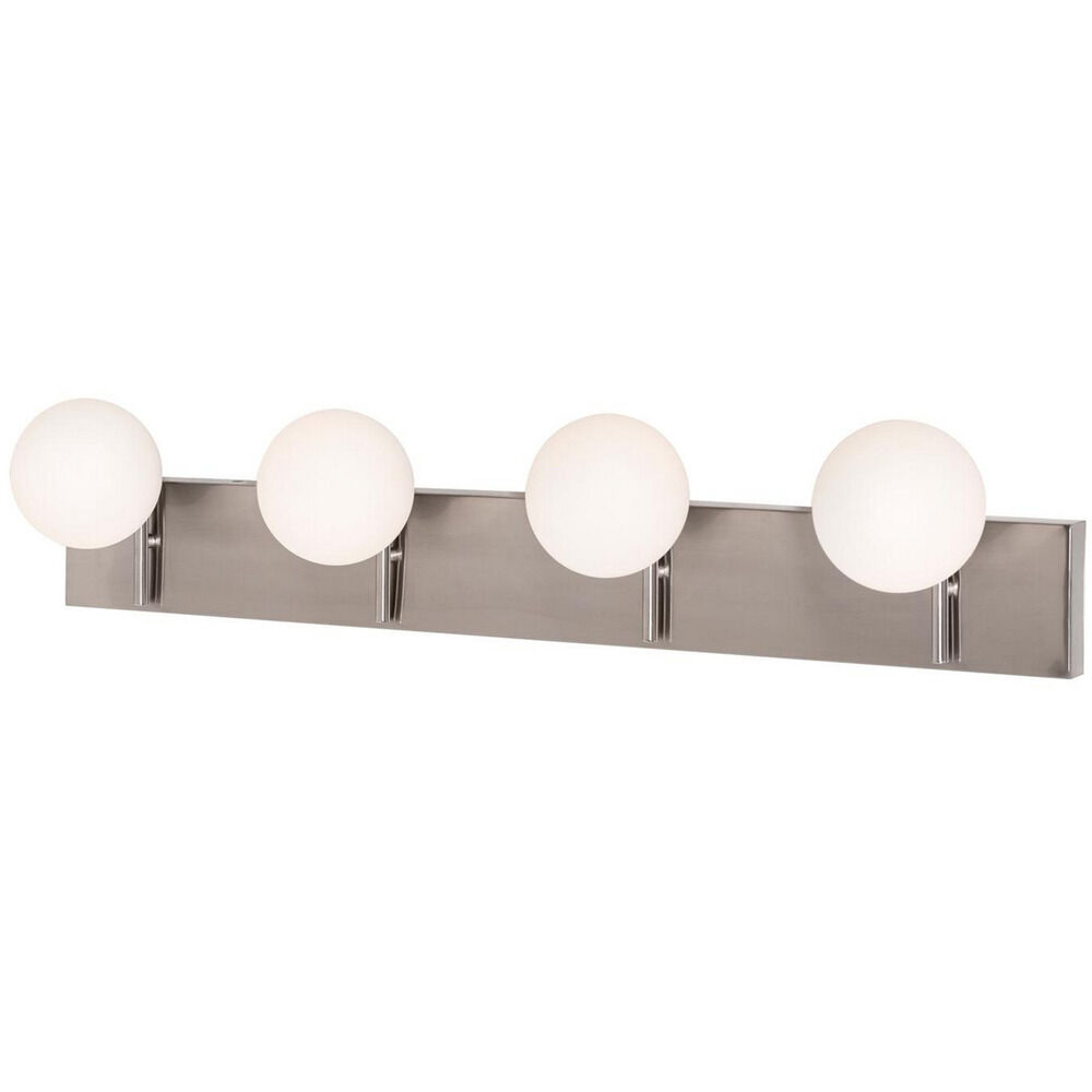 Modern appeal, LED vanity with white glass globe diffusers. Metal construction. Available in three finishes.