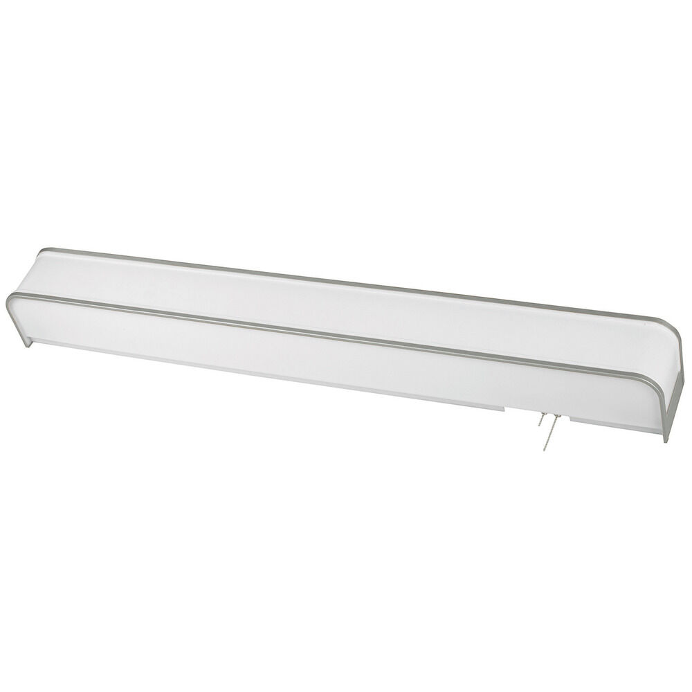 Curved design LED overbed with 4-way pull switch. Solid metal trim accents. White linen pattern acrylic front diffuser. White bottom and clear top acrylic diffuser disperses the light. Available in two finishes and two lengths.