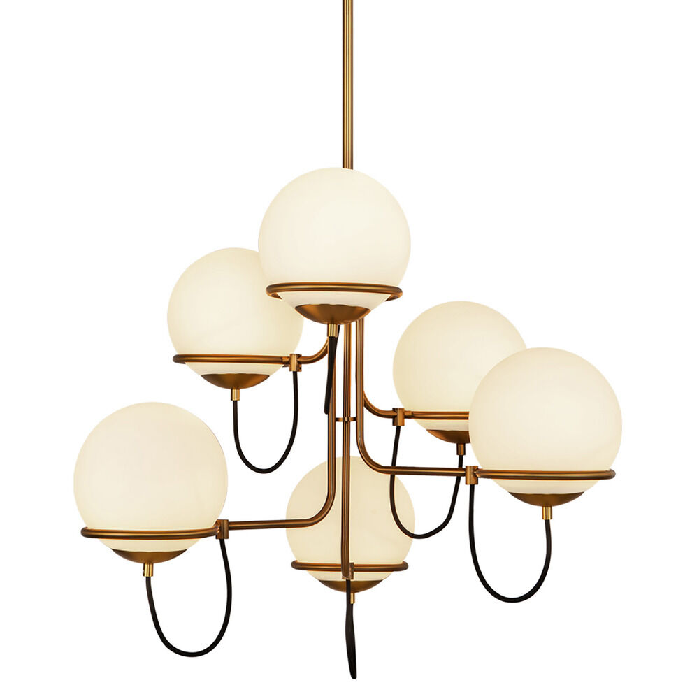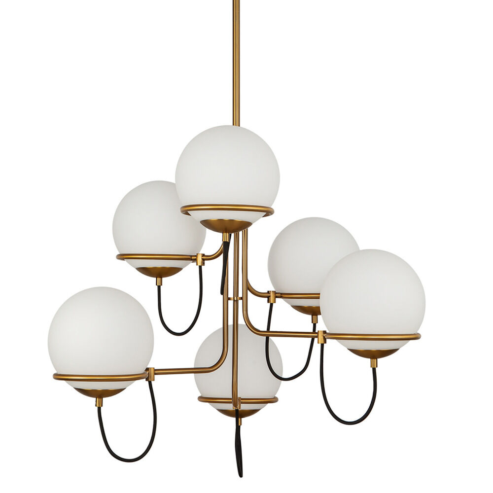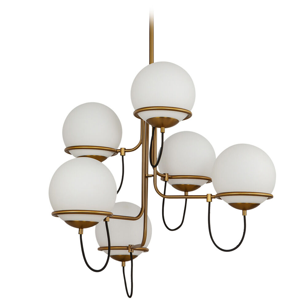 Contemporary / modern aged gold 6-light chandelier with matte opal glass shade