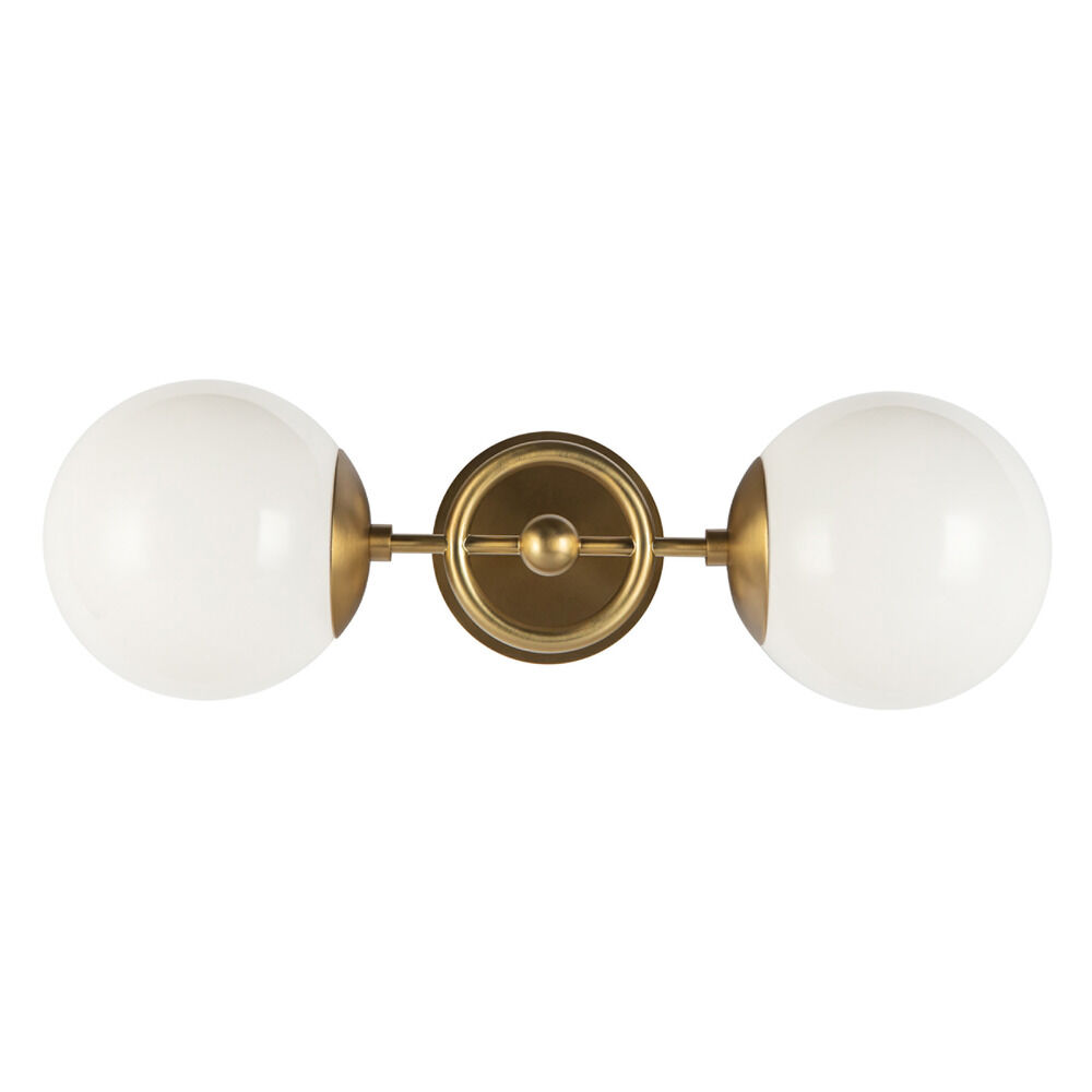 Contemporary / modern brushed gold 2-light bathroom light with glossy opal glass shade