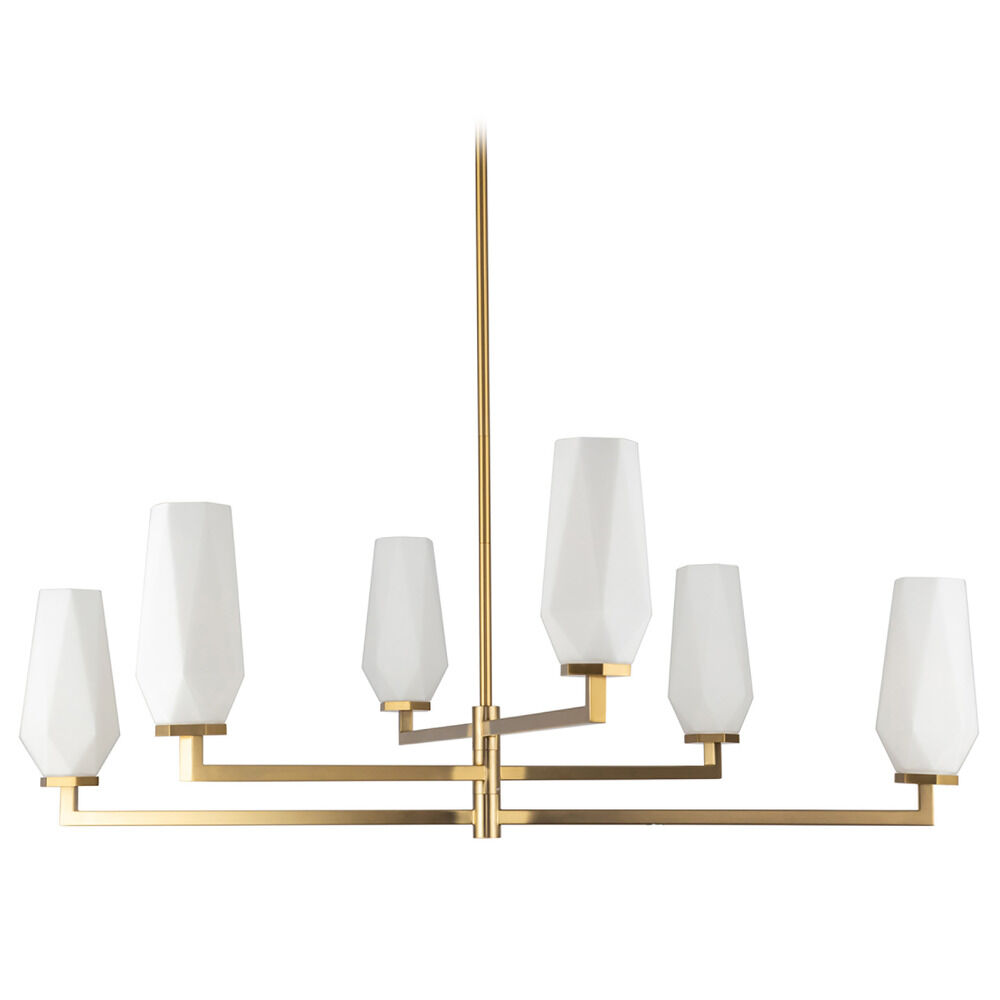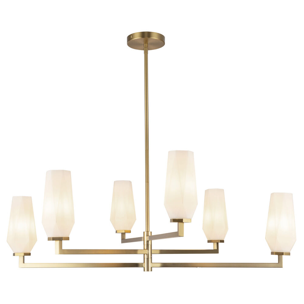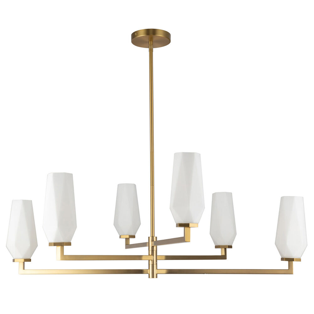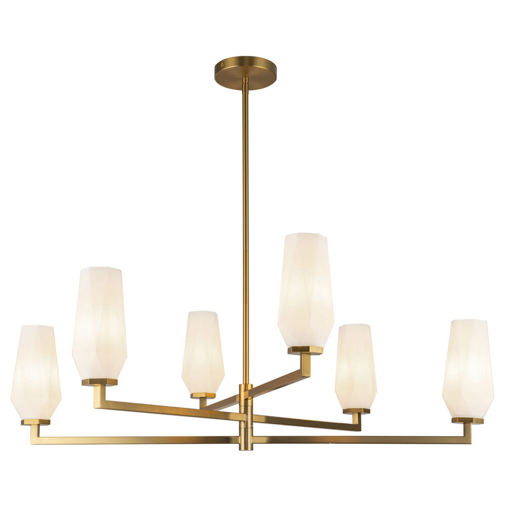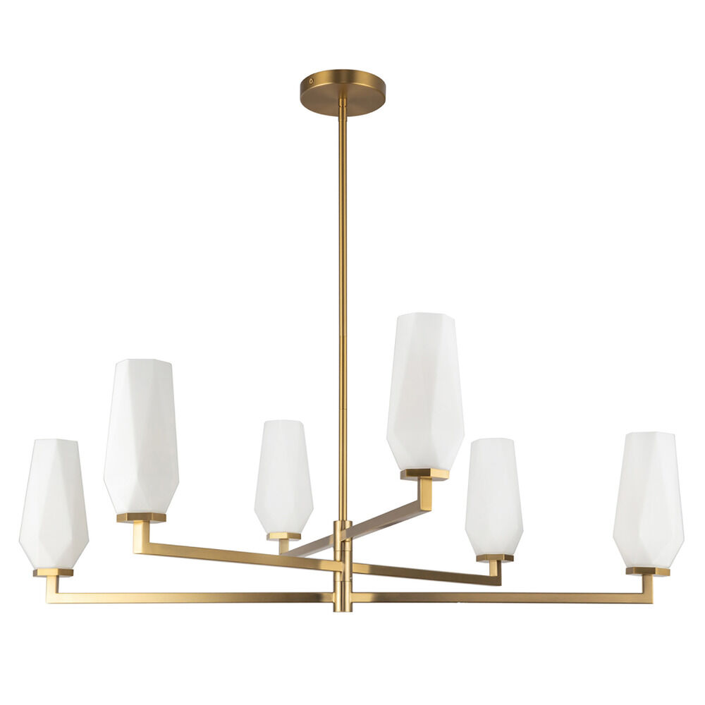 Contemporary / modern brushed gold 6-light chandelier with matte,faceted opal glass shade