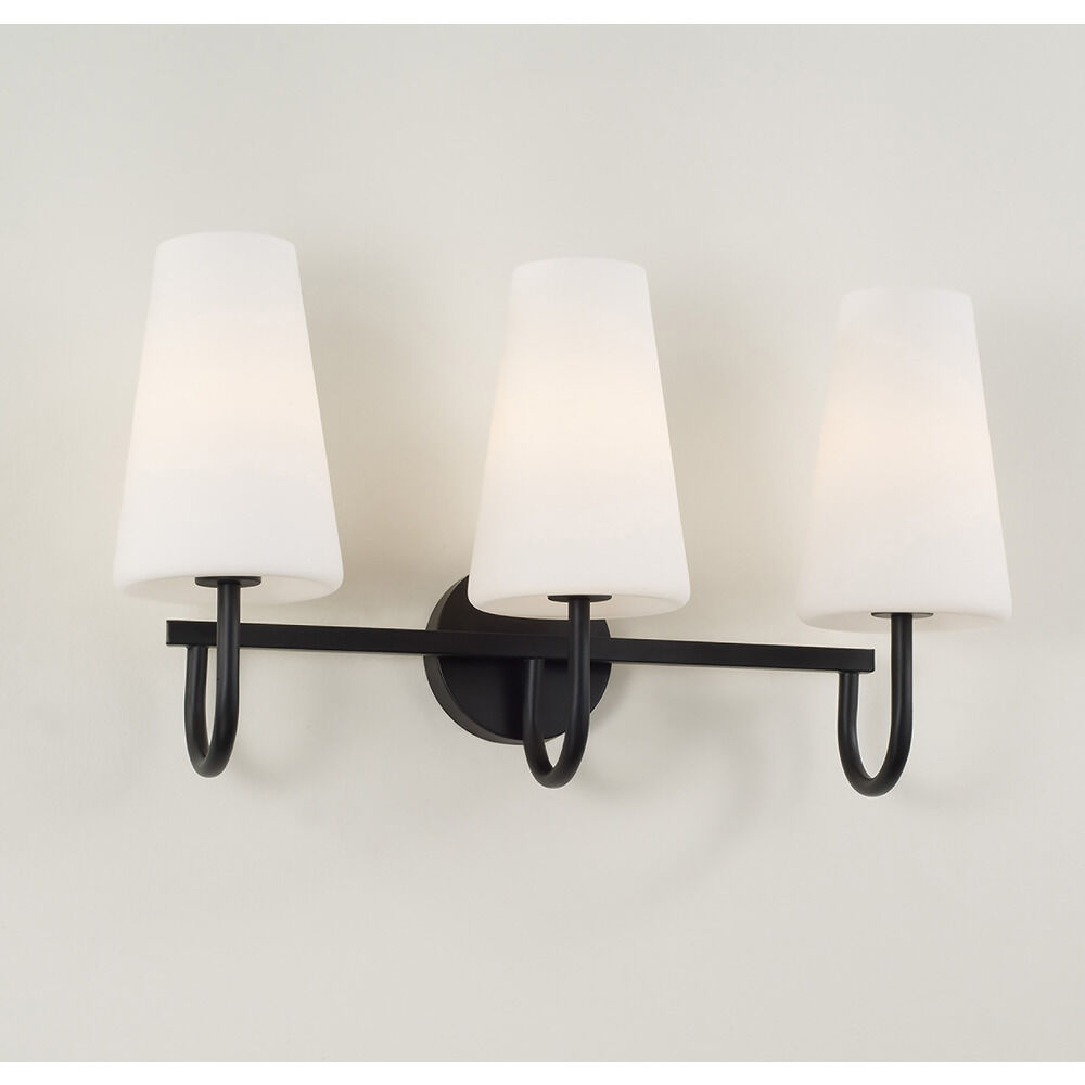 The Averitt 3-Light Vanity Light in Matte Black by Capital Lighting brings classic curves and elegant scale into a bold, modern aesthetic. Its elongated tapered shades in Soft White glass diffuse light into a warm, welcoming glow, balancing the fixture's strong lines with a sense of softness. Supported by sleek arms, the design delivers transitional style with a contemporary edge, making it a versatile addition to bathrooms and powder rooms.