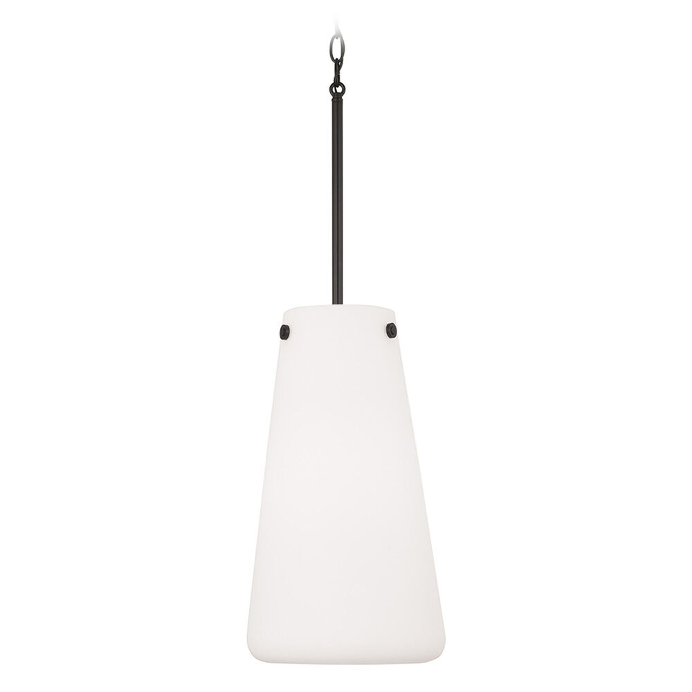 The Averitt Pendant in Matte Black by Capital Lighting offers a refined take on transitional style with a bold, modern edge. Its elongated Soft White glass tapered shade diffuses light into a warm, welcoming glow, while rivet adornments and a recessed rounded bottom bring depth and visual interest to the clean silhouette. These thoughtful details elevate the design, giving it a distinctive yet versatile character.