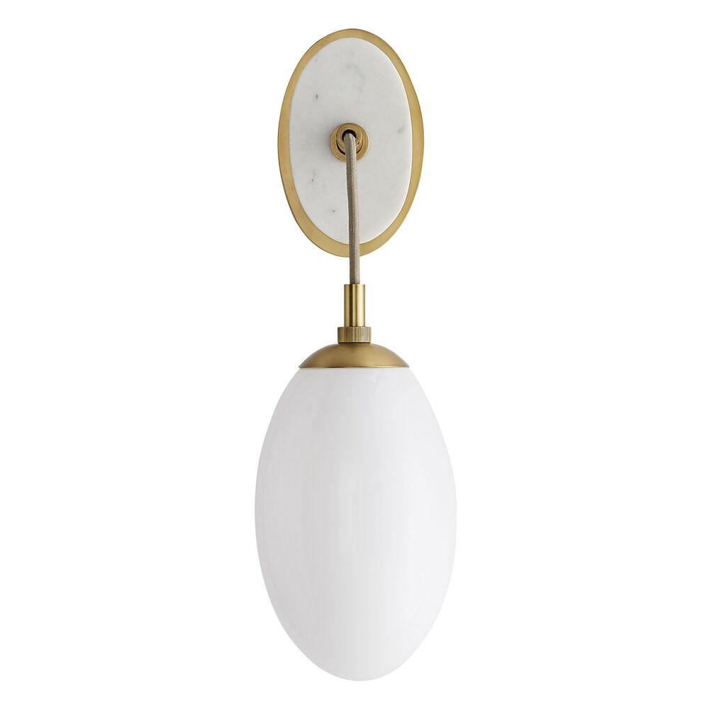 Add interest and texture to your space with the Bindi Sconce by Arteriors Home. The Bindi features an oval solid White marble stone backed with an Antique Brass backplate. From this plate hangs a teardrop-shaped Opal glass shade, suspended by a Taupe cloth cord. The Bindi is damp-rated.
