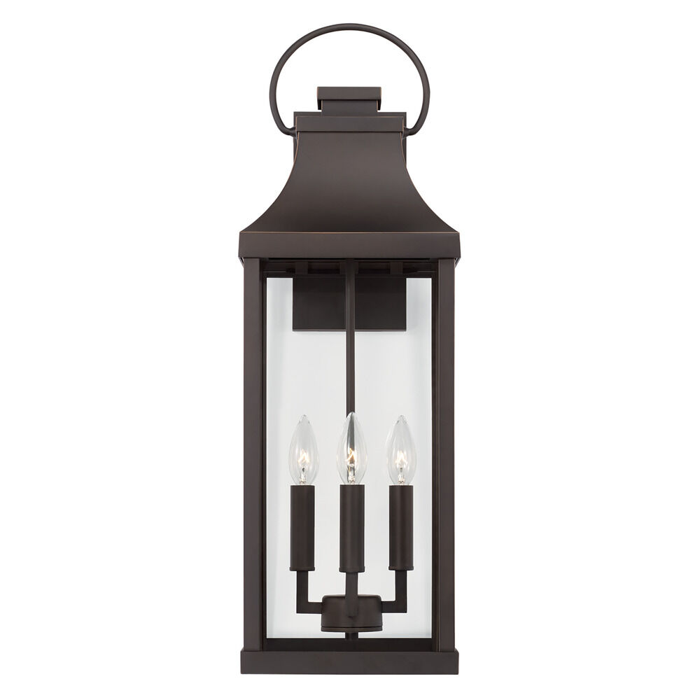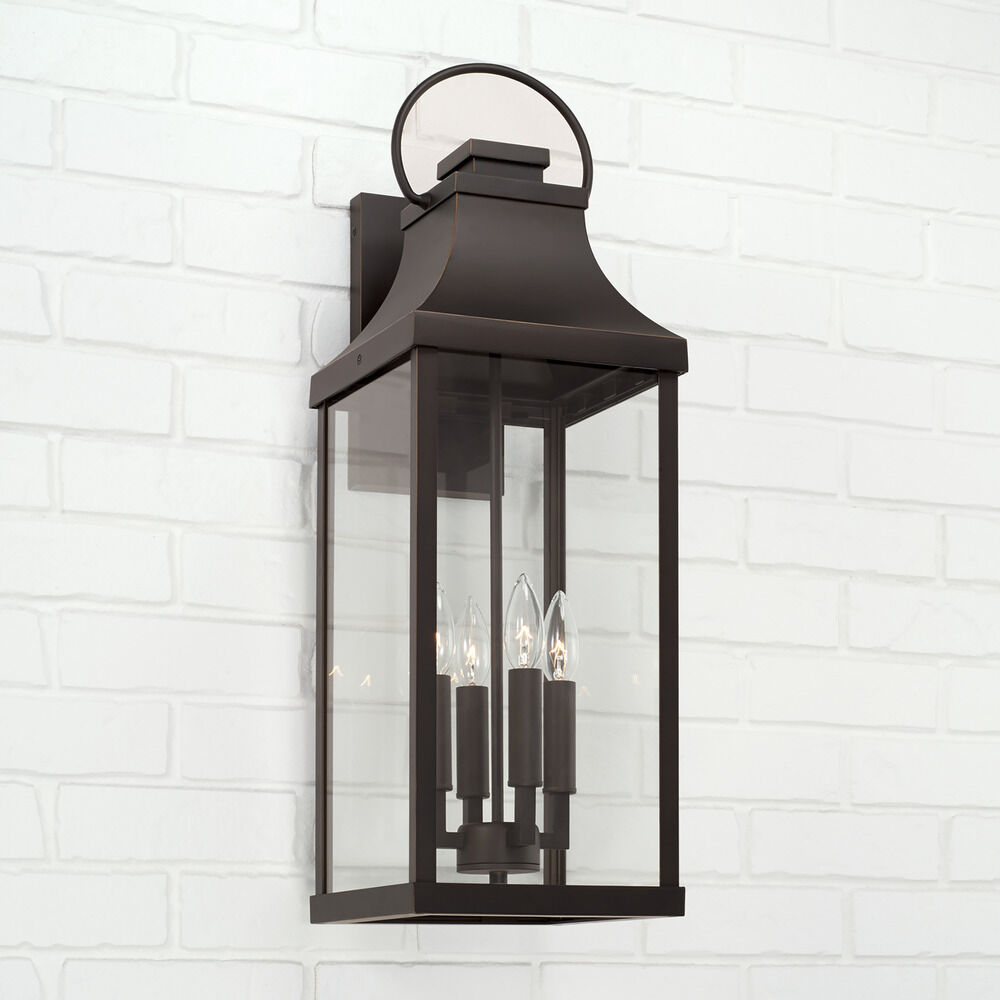 Illuminate the exterior of your home with Capital Lighting's Bradford Outdoor Wall Lantern. The Bradford features a rectangular frame in an Oiled Bronze finish, as well as Clear glass. A ring at the top of the fixture gives it its traditional Farmhouse look. The Bradford is open on the bottom for easy access to the bulbs, requiring four 60W maximum candelabra base light bulbs (not included). This fixture is rated for Wet Location.