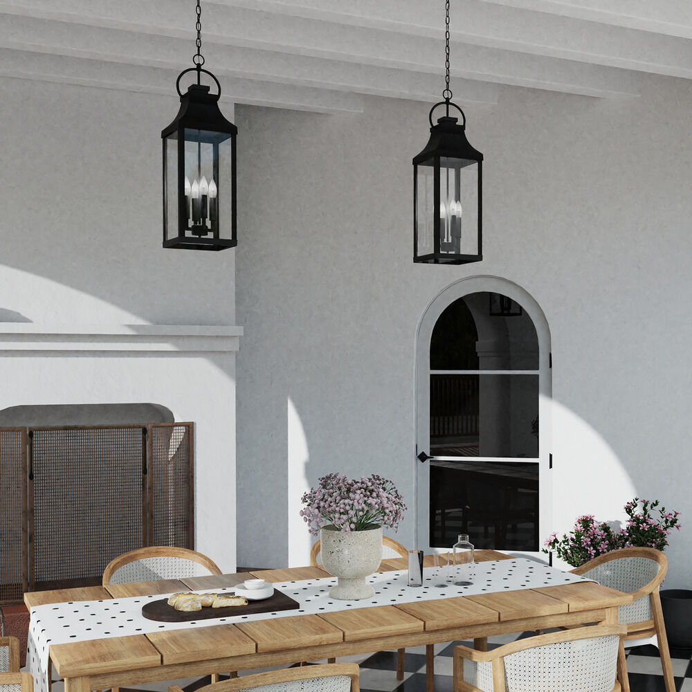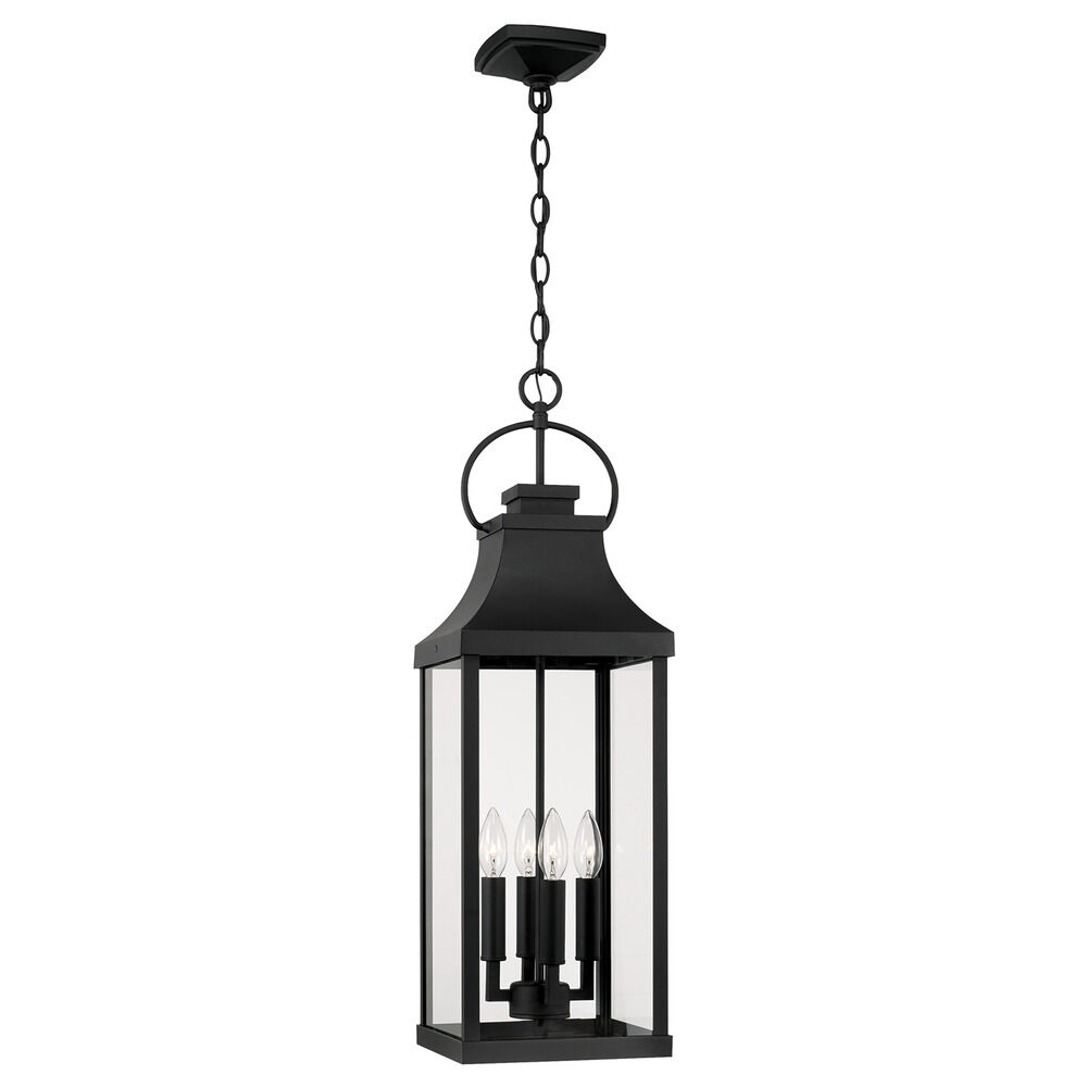 Illuminate the exterior of your home with Capital Lighting's Bradford Outdoor Hanging Lantern. The Bradford features a rectangular frame in a Black finish, as well as Clear glass. A ring at the top of the fixture gives it its traditional Farmhouse look. The Bradford is open on the bottom for easy access to the bulbs, requiring four 60W maximum candelabra base light bulbs (not included). This fixture is rated for Damp Location.