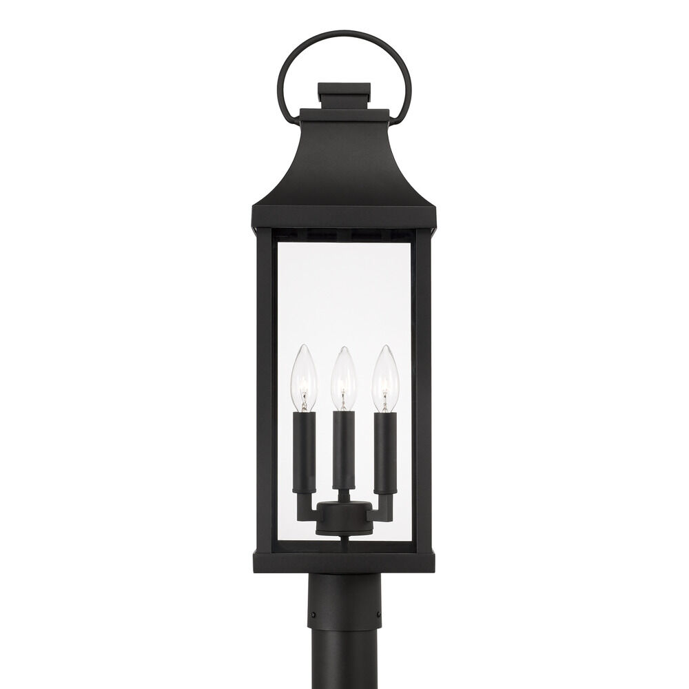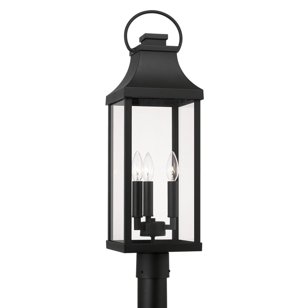 Illuminate the exterior of your home with Capital Lighting's Bradford Outdoor Post Lantern. The Bradford features a rectangular frame in a Black finish, as well as Clear glass. A ring at the top of the fixture gives it its traditional Farmhouse look. The Bradford opens at the top for easy access to the bulbs, requiring three 60W maximum candelabra base light bulbs (not included). This fixture is rated for Wet Location.