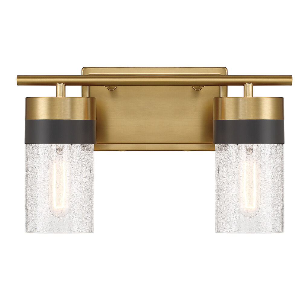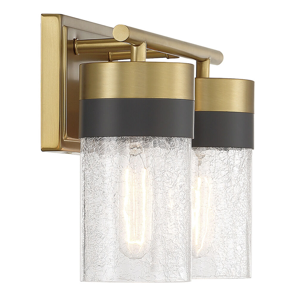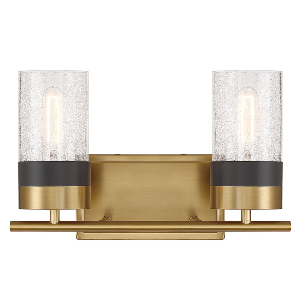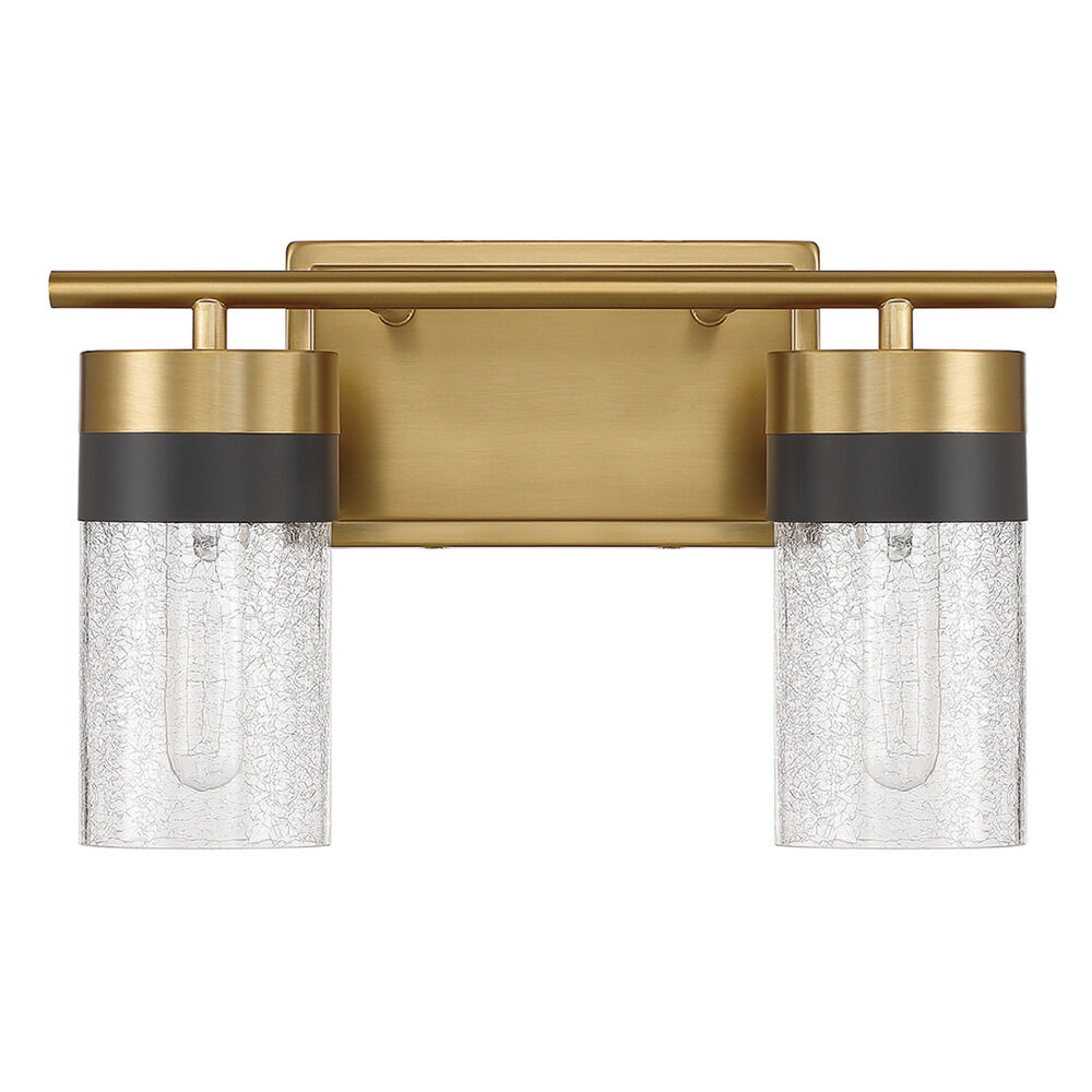 Warm up your bathroom decor with the Brickell Bath Light by Savoy House. This fixture features a Warm Brass finish with Black accents. It also includes Clear Crackle glass shades. The Brickell can be mounted facing either up or down.