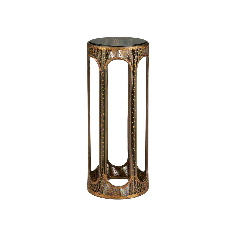 A round top of tempered glass in a smoke finish completes the design, harmonizing with the warm metallic palette while allowing the detailed base to remain visible. Because of the artisanal treatment and hand-applied finishes, slight variations in surface texture and coloration may occur, ensuring each Capella Accent Table is uniquely its own.