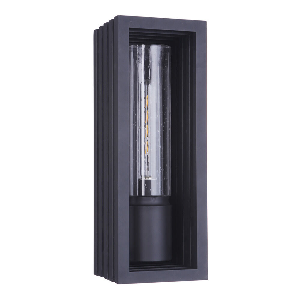Contemporary / modern textured black 1-light outdoor wall light with clear,seeded seeded glass shade