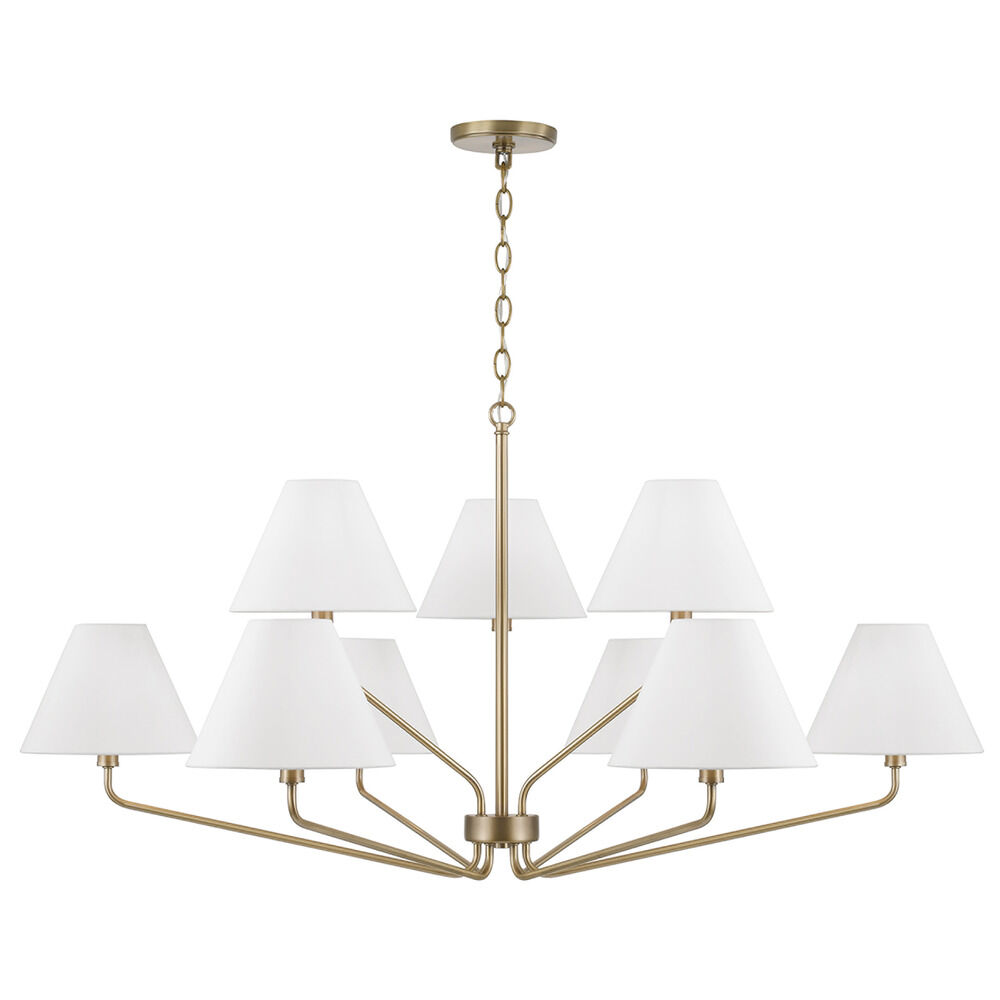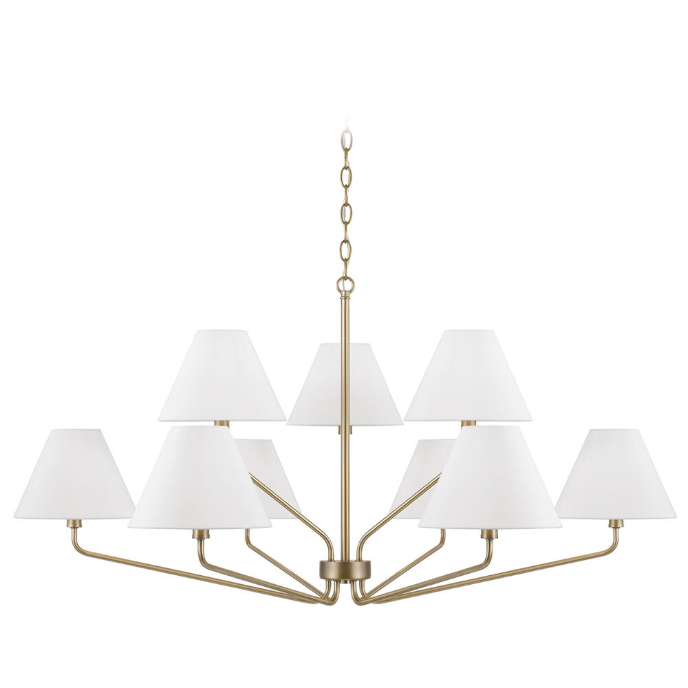 Transitional aged brass 9-light chandelier with white fabric shade