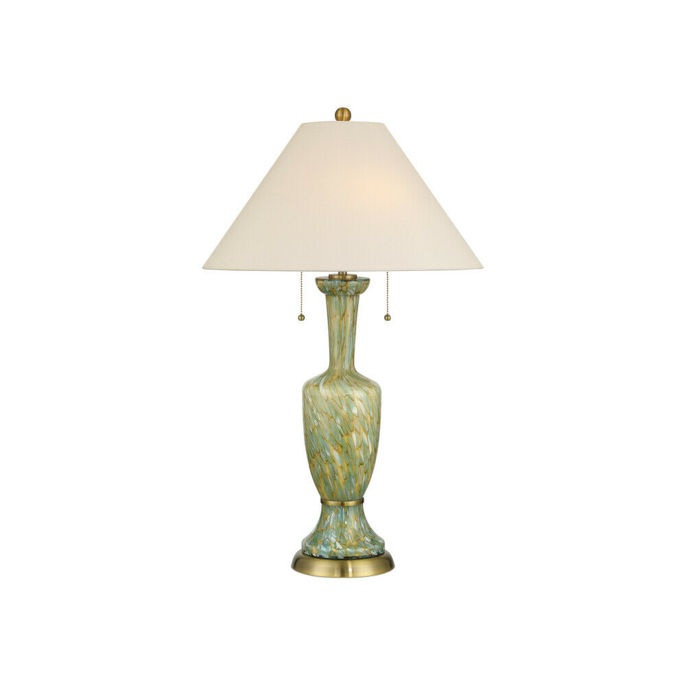 An empire shade completes the lamp, casting light across the swirling green, yellow, and beige patterning on the surface and enhancing its depth and movement. Because the lamp is made from artisanal glass, subtle variations in color and texture may occur, ensuring each piece is uniquely finished.