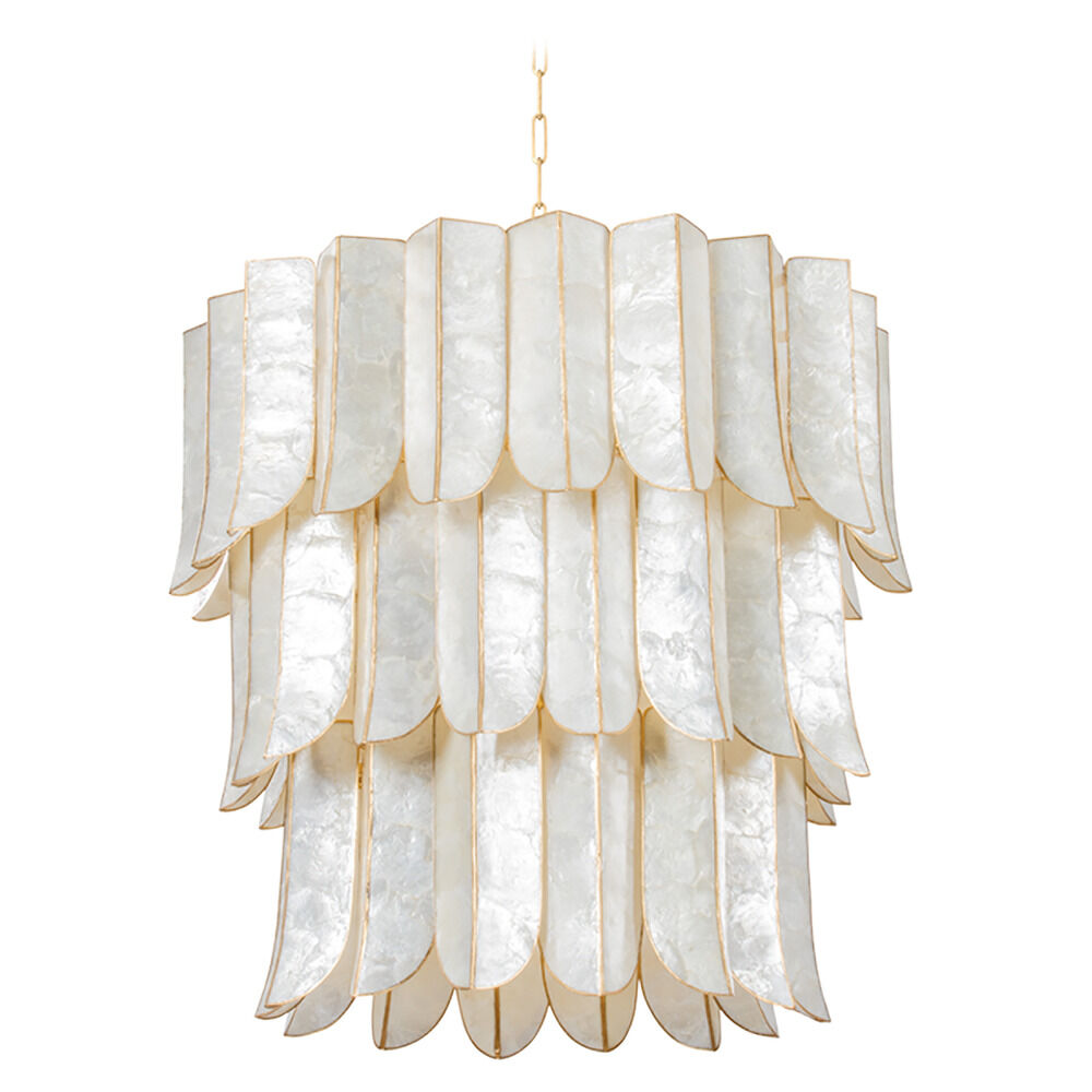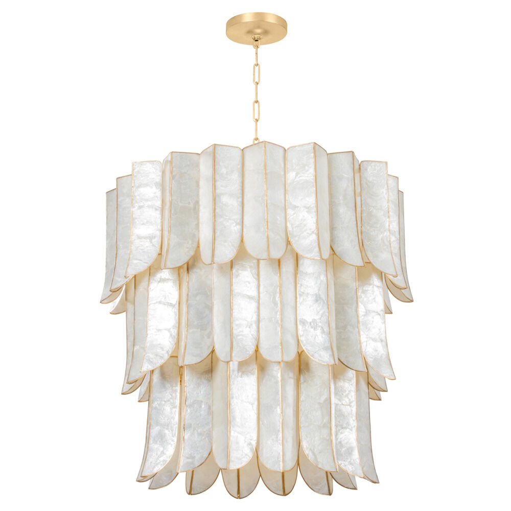 Capturing the dynamism of its namesake city, Cartagena cuts an impressive figure with its shimmering layers and exquisite materiality. Tiers of lustrous leaf-shaped panels crafted from fine Capiz Shell exude drama and decadence. Vintage Gold Leaf heightens the glamor of this statement piece, which comes as a sconce or chandelier in three sizes. Due to the one-of-a-kind nature of the medium, exact colors and patterns may vary slightly from the image shown.