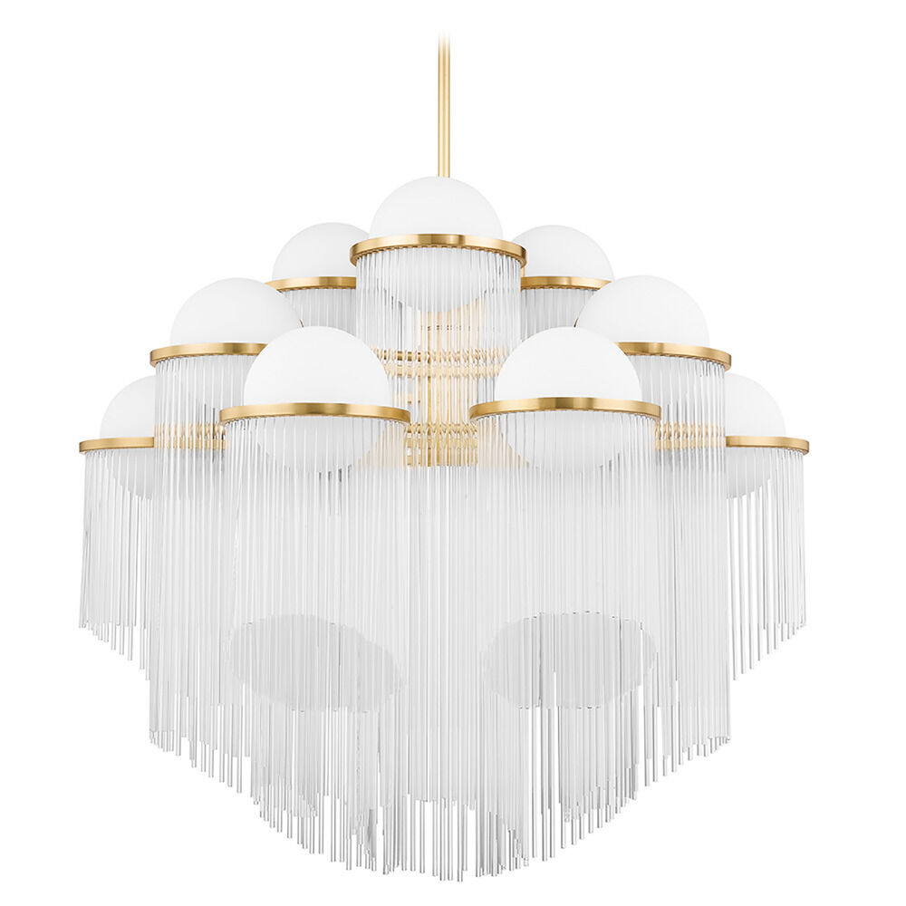 With an old Hollywood aesthetic, Celestial pays homage to the stars. Angled glass rods rain down from aged brass rings that encircle opal matte globes. Ample light fills the globes and illuminates the rods floating underneath. This dramatic design is sure to take center stage in any space.