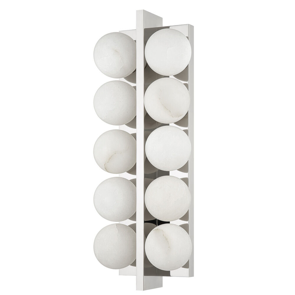 Drawing inspiration from Art Deco jewelry design and playing with shape, symmetry and repetition, this chic sconce features pairs of alabaster globes on a rectangular metal backplate separated by a metal spine at the center. The globes reflect off the Vintage Brass or Polished Nickel finish, creating a mirror-like feel and the alabaster gives off a soft light.Due to the one-of-a-kind nature of the medium, exact colors and patterns may vary slightly from the image shown.