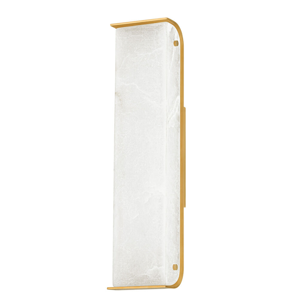 Inspired by the grandeur Greek architecture, this statuesque wall sconce features a thick alabaster stone slab ensconced within a Vintage Brass frame. With its natural veining and translucency, the ivory alabaster reveals its color and texture when lit. Available in two sizes, Hera presents a striking visual display in a hallway or bathroom. Due to the one-of-a-kind nature of the medium, exact colors and patterns may vary slightly from the image shown.
