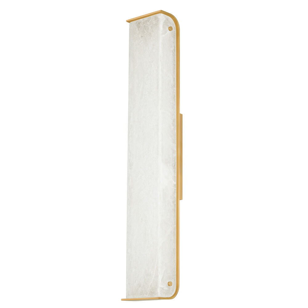Inspired by the grandeur Greek architecture, this statuesque wall sconce features a thick alabaster stone slab ensconced within a Vintage Brass frame. With its natural veining and translucency, the ivory alabaster reveals its color and texture when lit. Available in two sizes, Hera presents a striking visual display in a hallway or bathroom. Due to the one-of-a-kind nature of the medium, exact colors and patterns may vary slightly from the image shown.
