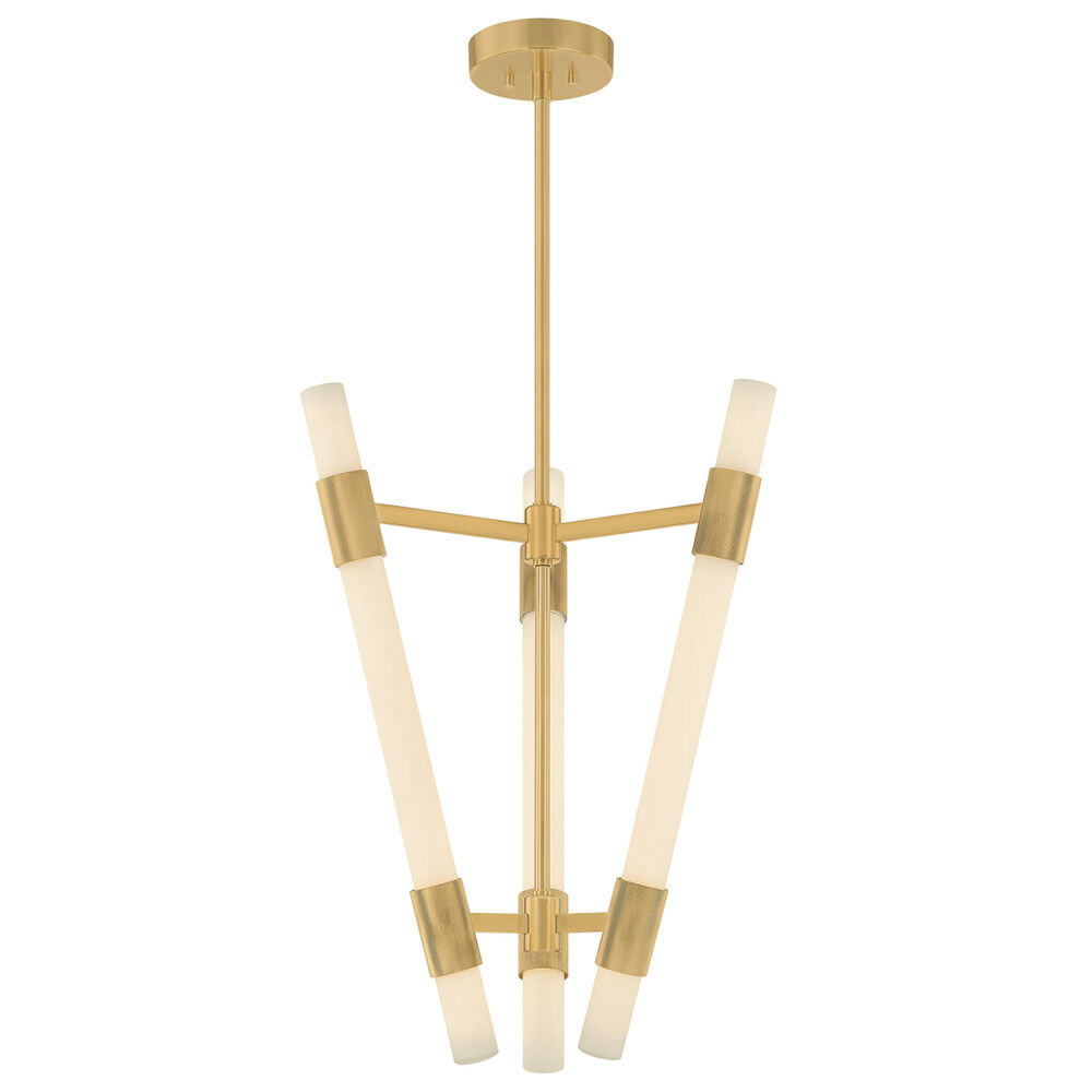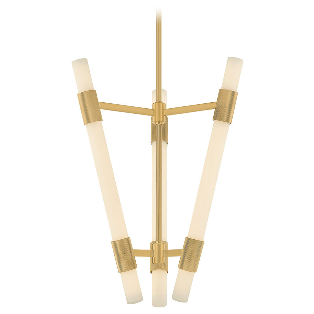 The futuristic design of Krakow uses minimalist forms to create a maximalist statement. Simple matte cloud glass tubes are illuminated by LED, providing bright overhead lighting without a harsh glare. Warm Vintage Brass cuffs with ribbed detailing support the shades, which tilt away from the frame to disperse light and create a striking visual impression from below. Available in two sizes, Krakow is a perfect choice for open staircases, grand foyers, or any area in need of a showstopping feature.