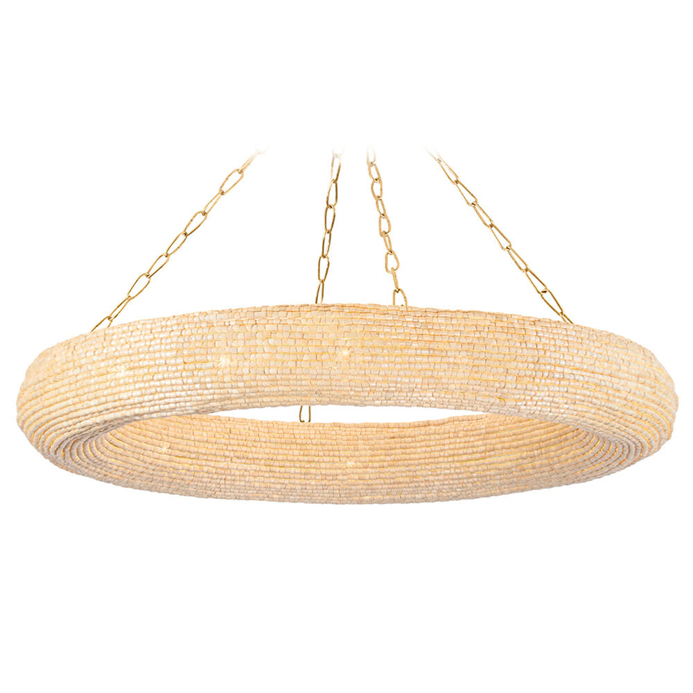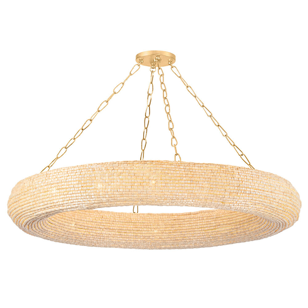 Inspired by the tropics, this large-scale chandelier exudes coastal elegance. The classic donut-shaped shade is adorned with hundreds of handmade wood beads in a light brown hue recalling sand and shells. Chunky Vintage Gold Leaf chains complete this bohemian-inspired chandelier, which comes in two sizes. Due to the one-of-a-kind nature of the medium, exact colors and patterns may vary slightly from the image shown.