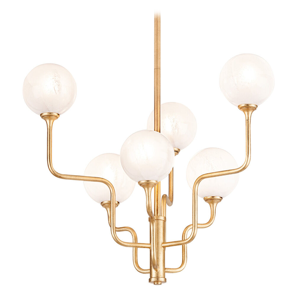 Small globes of opal cloud glass rest on sprawling, curved arms giving Onyx an uplifted and airy feel. Etched on the inside, the globes create a warm light. An extra layer of patina gives the gold leaf finish on the metal work its vintage look. Available as a single or 3 light sconce, 8 light flush mount or 6 or 12 light chandelier, there's a place for Onyx in any space.
