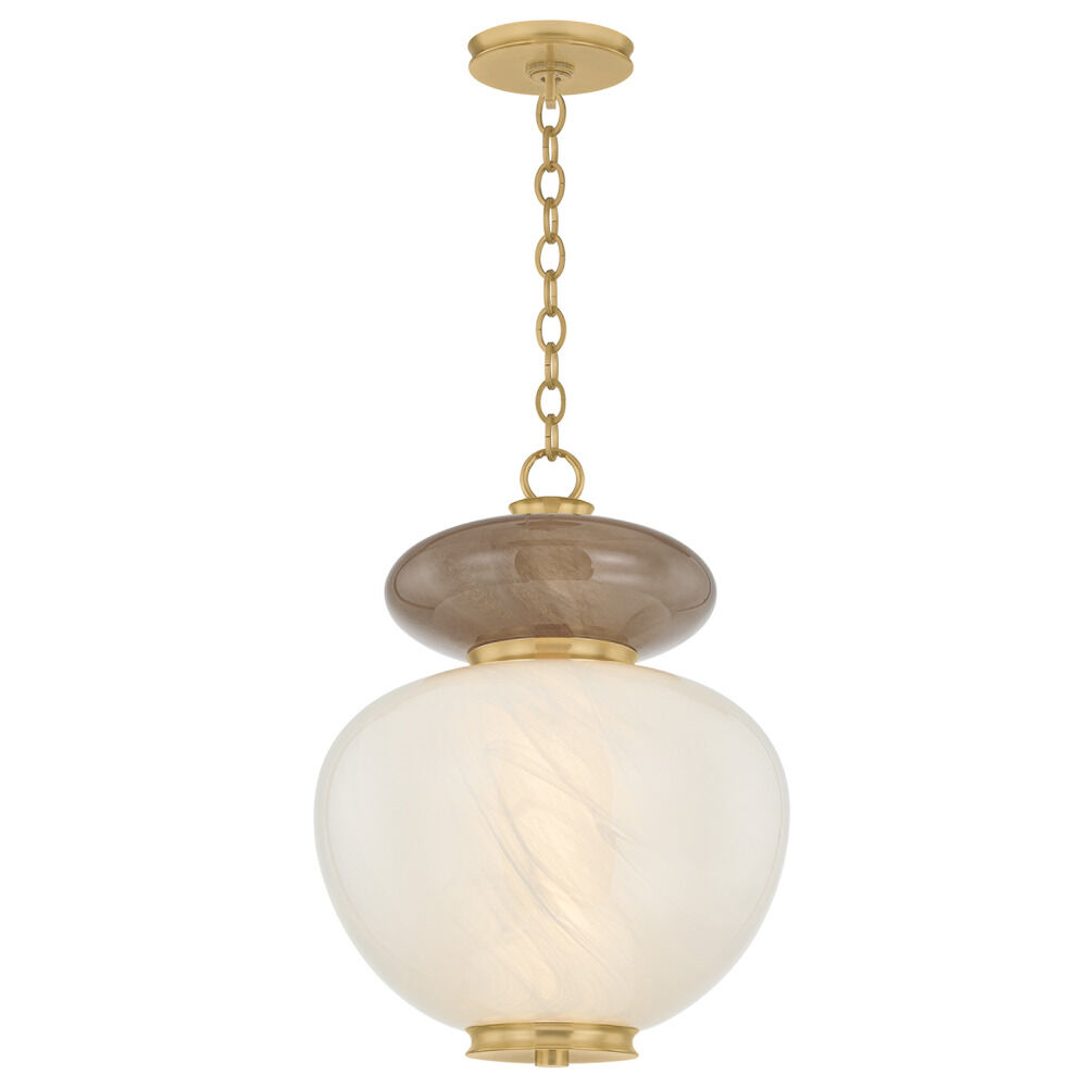The organically-shaped Syros pendant is designed to be symmetric enough for use in multiples, while still feeling ornamental and elevated. It features a large Remolino Blanco glass shade topped by a smaller affogato glass shade. The sculptural stacked design is brought to life by the sense of movement in the specialty glass, accented by polished Vintage Brass metalwork. Available in two sizes.