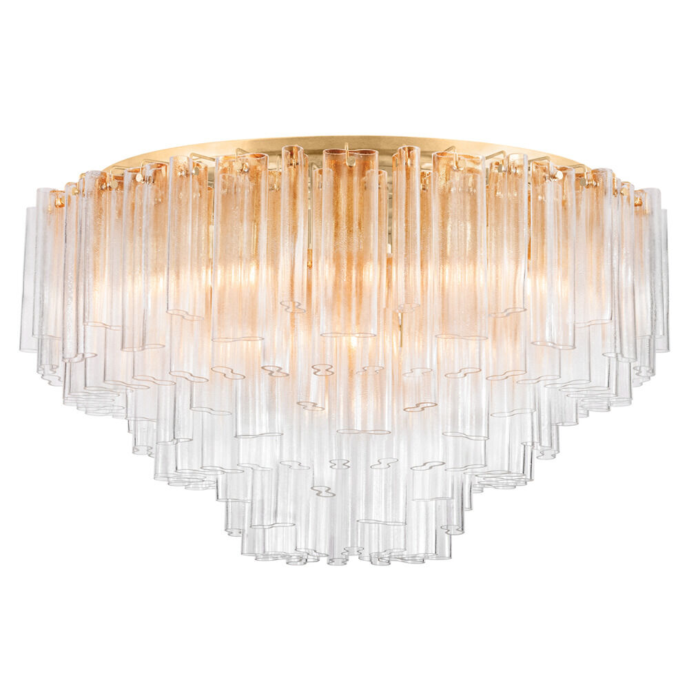 Mesmerizing Piastra glass tubes are layered in tiers to create the grand vision of Varenna. A soft, organic reimagining of an Art Deco silhouette, this flush mount comes in three sizes to create focal points in different-sized spaces. The sculpted waves in the specialty glass evoke an ethereal sense of movement while allowing for a more dynamic light diffusion. The close-to-ceiling canopy frames the fixture like a halo, finished in Vintage Gold Leaf.