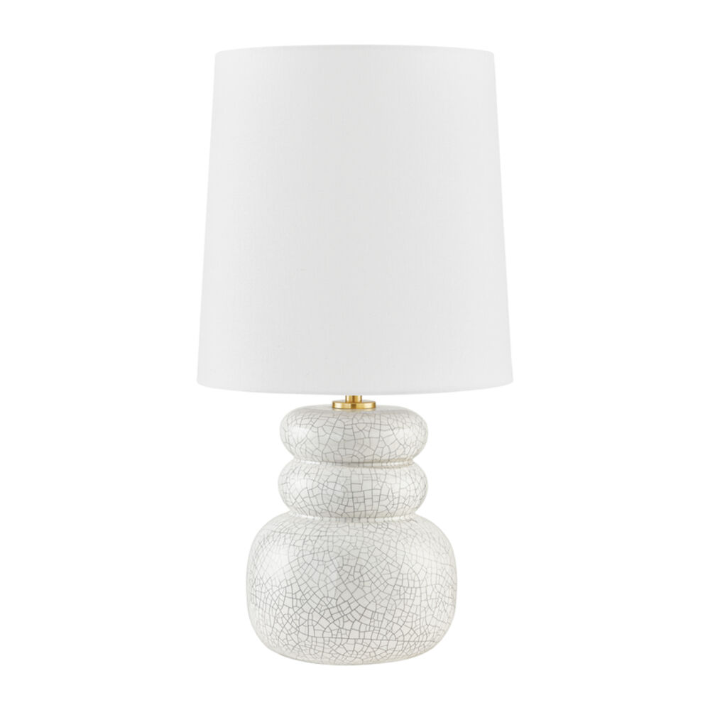 Contemporary / modern aged brass & ceramic peignoir crackle 1-light table lamp with white linen shade