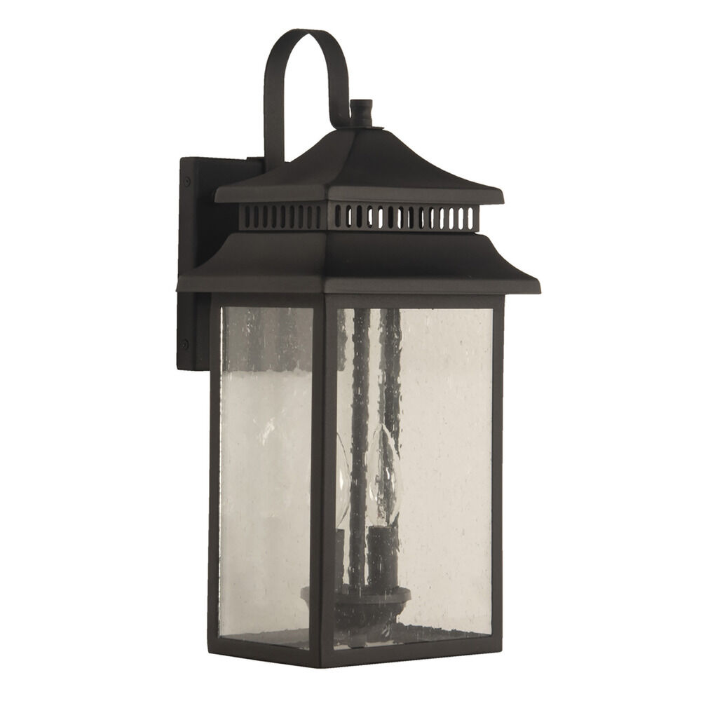 Traditional textured black 2-light outdoor wall light with clear,seeded seeded glass shade