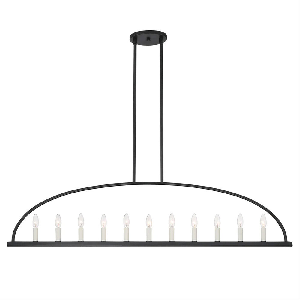 The Abbott linear chandelier presents a simple, streamlined shape and clean lines. The open-concept frame features a metal arch and a sleek, narrow rod with a series of thin bulbs. Mounted above an island or over a dining room table, this fixture appeals to a minimalist sense of style. The Abbott comes in vibrant gold and black finish.