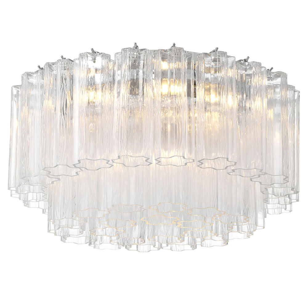 The captivating Addis Lighting Collection is a modern-day interpretation of the iconic mid-century Tronchi chandelier. Inspired by its predecessor's sleek lines and geometric shapes, the Addis features a polished Chrome or Aged Brass metal frame that exudes sophistication and style. Its unique design showcases transparent tiers of textured Tronchi glass tubes, forming a mesmerizing 5-point rounded star shape. Choose from a range of glass colors, including clear, amber, smoke, and white, or the stunning Autumn option, which features a captivating multicolor disposition of amber, clear, and smoke Tronchi glass. The Addis Lighting Collection offers various sizes and finishes, allowing you to find the perfect fit for your space while adding a touch of timeless elegance.