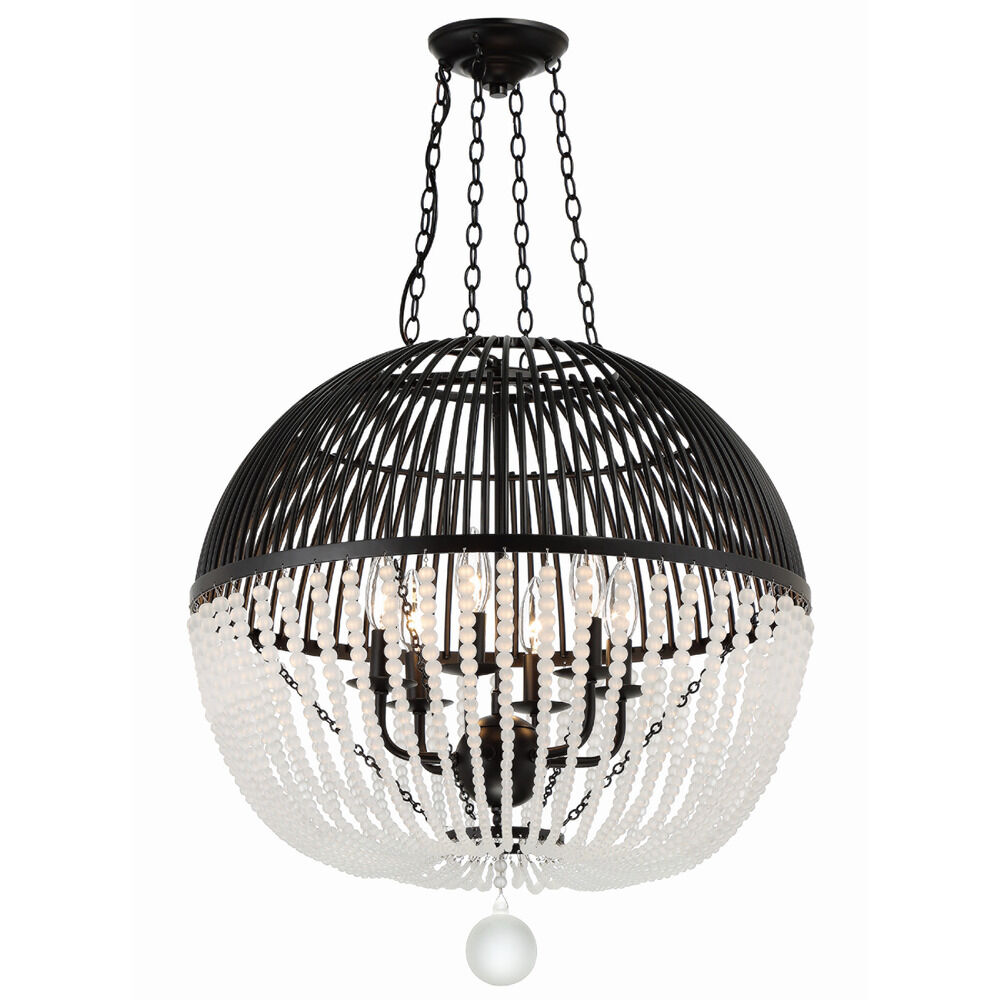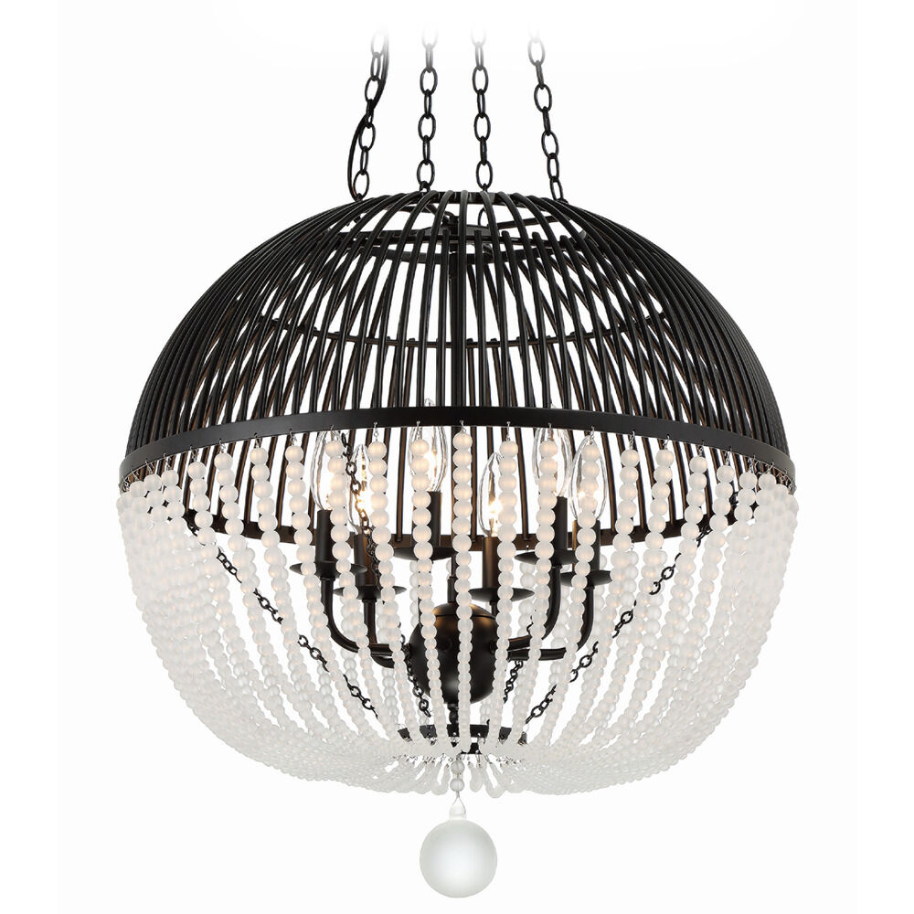 Candelabra lights shine through the open metal caged design of the Duval hand painted fixture. The rhythmic frame features hundreds of frosted round glass beads cascading in strands inward to where a single metal ball hangs. This statement piece is perfect to add grandeur to a dining room, hallway or bedroom.