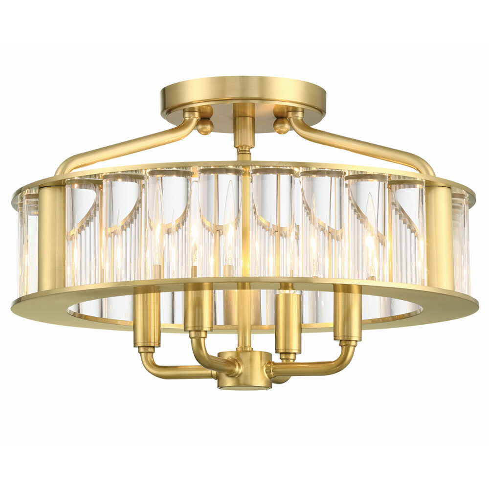 The Libby Langdon Farris Semi-flush light comprises solid thick glass rods and a sleek metal frame in a Vibrant Gold brushed finish. The open frame at the top and the bottom of the fixture is airy and light, while the generous diameter of the glass rods gives a substantial and luxurious feel. The center rod that holds the four candelabra light sections drops below the lower round frame just enough to add another dimension and visual interest. The soft slope of the top rods that connect to the upper canopy adds ease and elegance to the overall profile of the Farris semi-flush fixture. The Farris collection is a new contemporary take on a classic crystal chandelier.