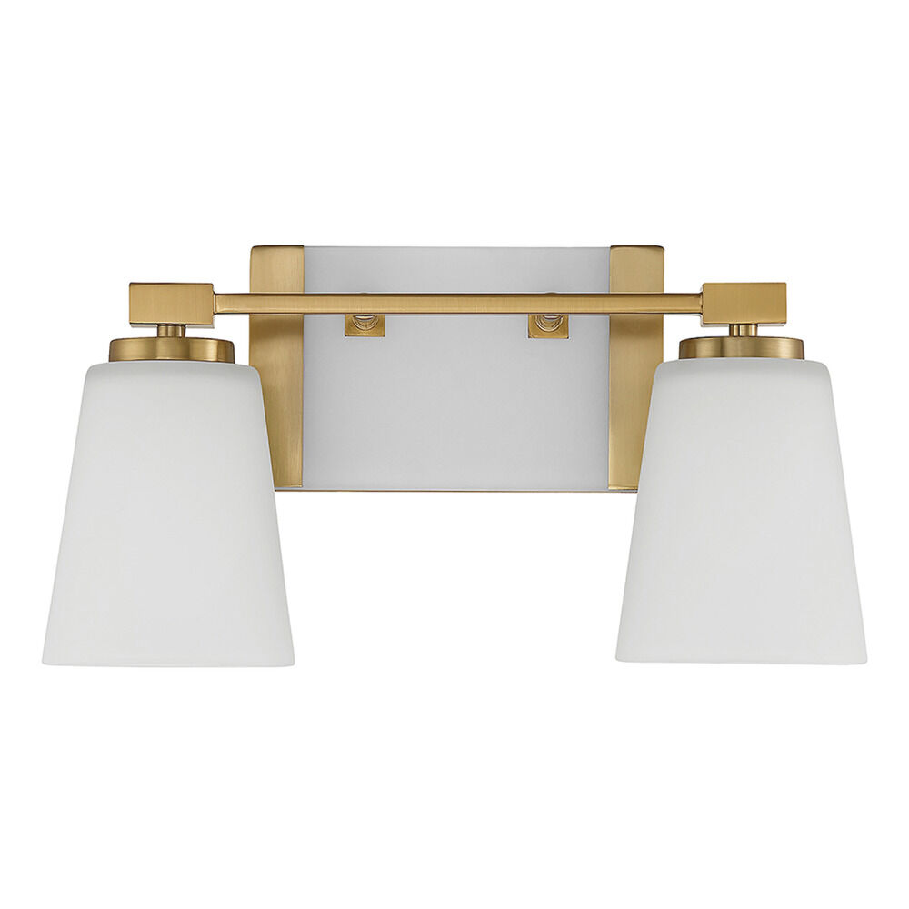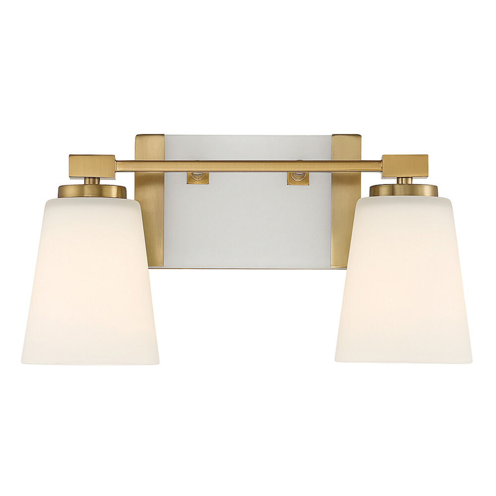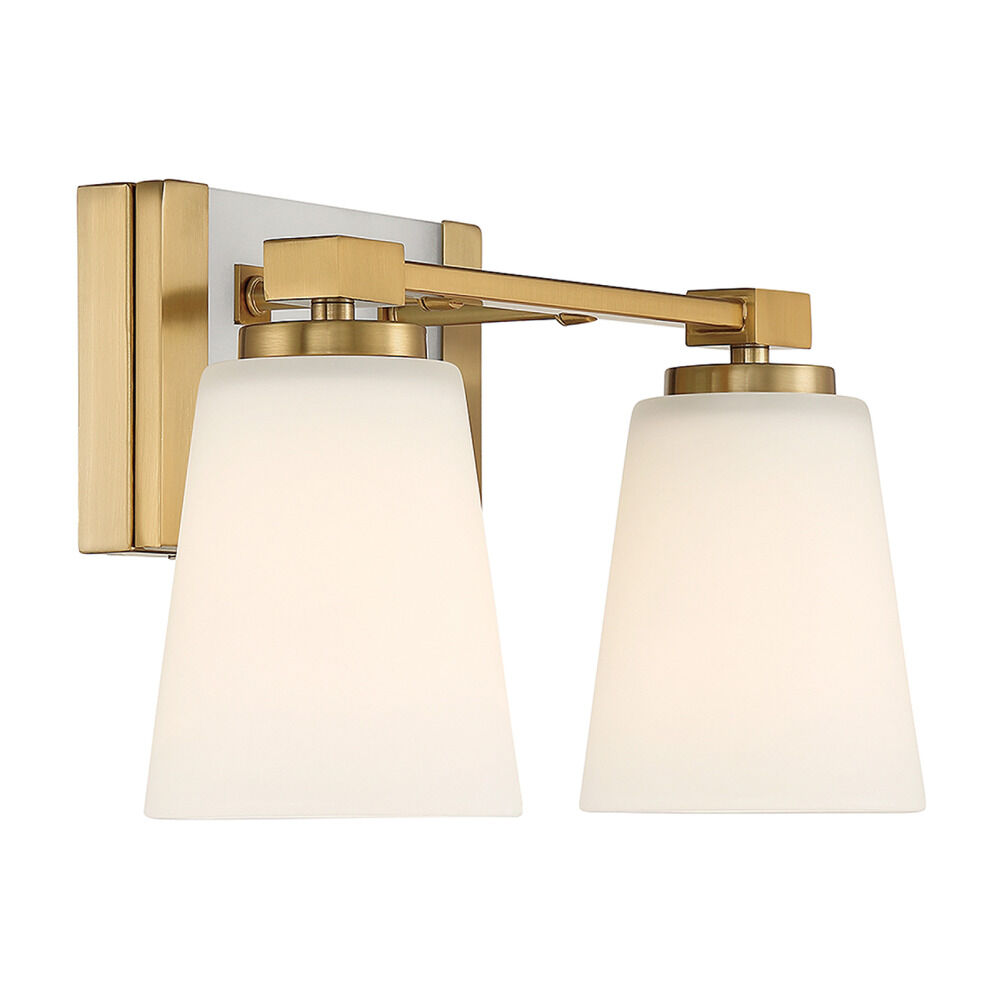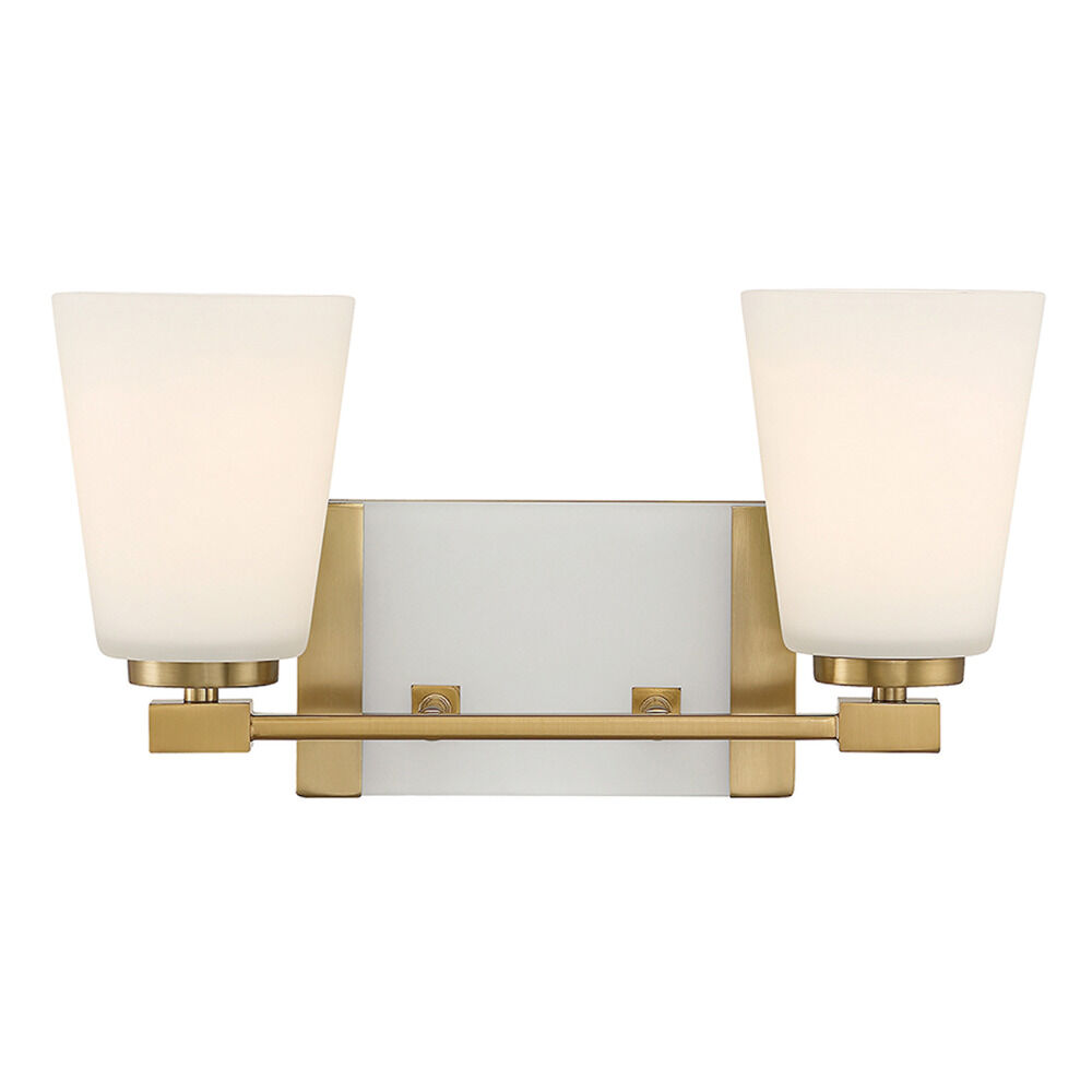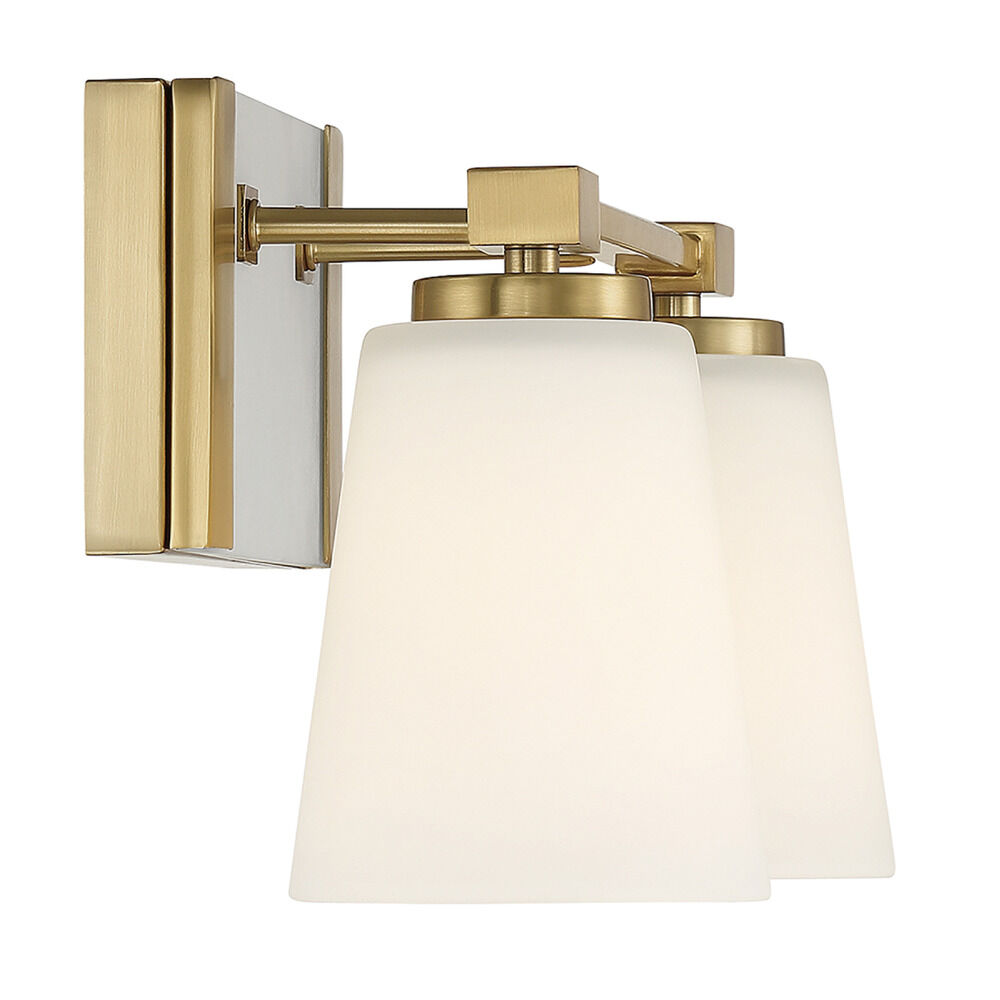 Enhance your bathroom decor with the Darby Bath Light by Savoy House. This fixture features a gorgeous Warm Brass finish. This contemporary fixture also includes conical White glass shades and can be mounted facing either up or down.