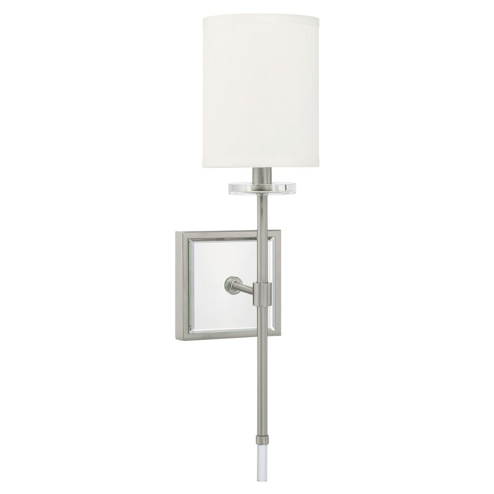 Elevate your powder room with the Edin Wall Sconce by Capital Lighting. This sconce features a Brushed Nickel finish and a slender form that is adorned with K9 crystal pieces at the top and at its base. A Stay-Straight White fabric shade is included. This wall mount is rated for use in Damp locations.