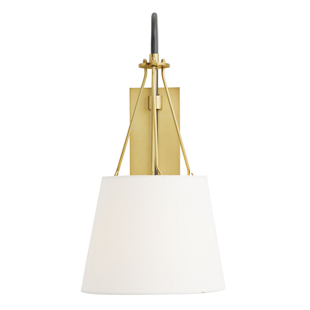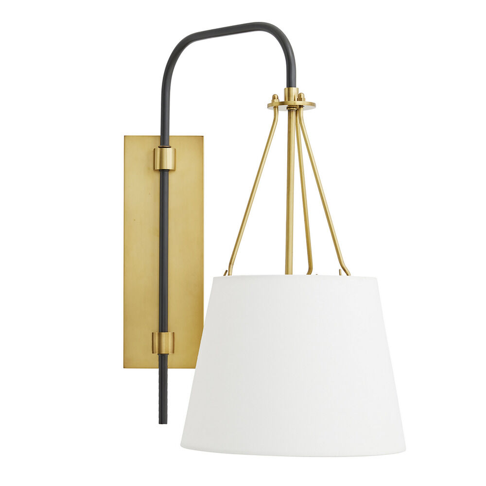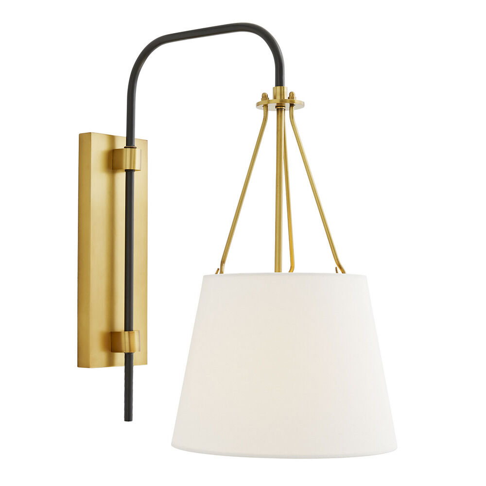 The Franklin Sconce by Arteriors Home features a steel chandelier-style hanging detail in an Antique Brass finish. A white linen shade is suspended from an arched Bronze arm, adding traditional elegance to the piece. This arm swings, making the Franklin ideal as a bedside fixture or as a wall mount in a reading nook.