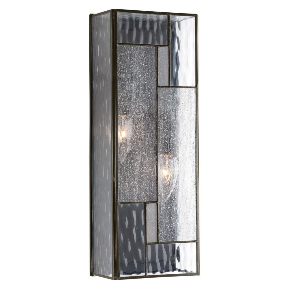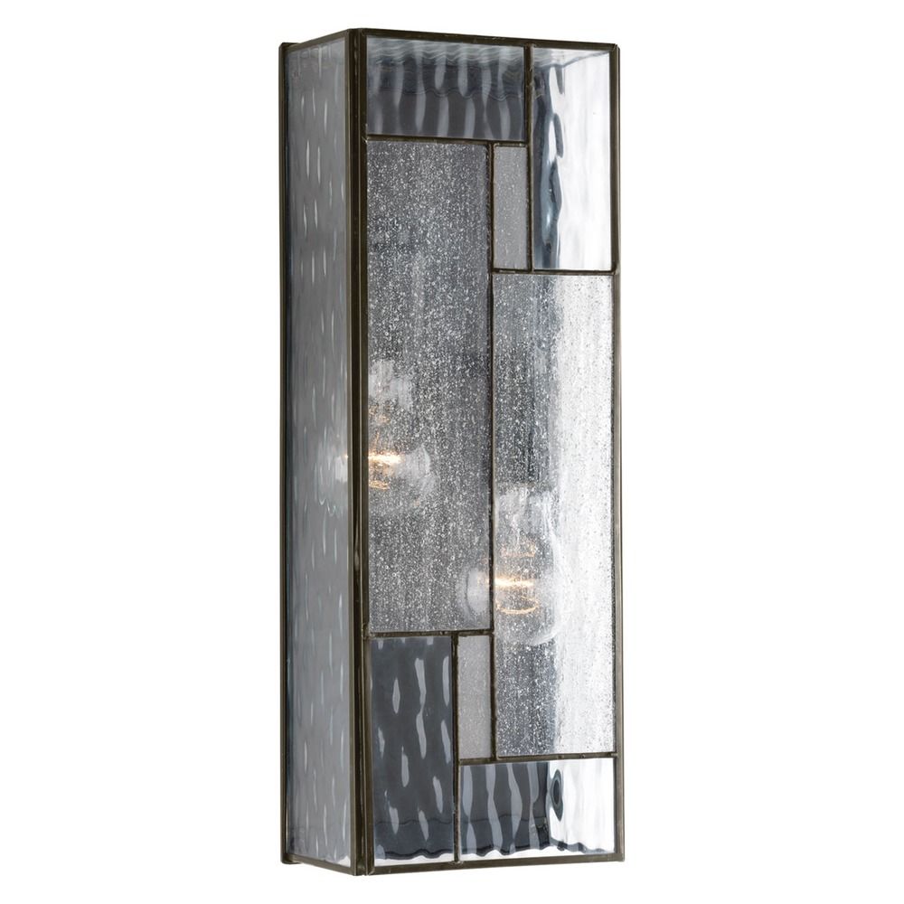 Transitional architectural bronze 2-light outdoor wall light with optic hammered, water, seeded glass shade.
