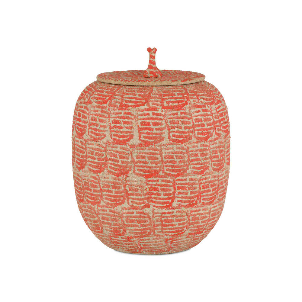 The Happiness Red Preserve Jar is a striking decorative accent crafted from porcelain in a rich palette of red and beige. Its surface is stamped with motifs that resemble Chinese characters, lending the piece a sense of cultural symbolism while maintaining a refined, decorative appeal. The patterning adds depth and visual interest, giving the jar a timeless yet expressive character.